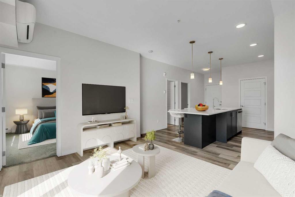 BRIGHT, BEAUTIFUL & MOVE-IN READY in the heart of Harvest Hills!! Welcome to Unit 410 at 200 Harvest Hills Place NE — a spectacular south-facing, top-floor 2 BED, 2 BATH condo. Perched on the top floor with a coveted south-facing exposure, this stunning 694 sq ft residence is drenched in warm natural sunlight from morning to evening, creating an atmosphere that feels bright, welcoming & effortlessly uplifting every single day. The thoughtfully designed open-concept layout flows beautifully between the kitchen, dining & living areas, creating a versatile & connected space that's equally suited to quiet evenings in or lively gatherings with friends & family. High-quality vinyl plank flooring grounds the space with warmth and sophistication, while the neutral colour palette throughout provides the perfect canvas for your personal style. At the heart of the home lies a truly IMPRESSIVE KITCHEN that will delight even the most passionate home chef. Premium stainless steel appliances, gleaming quartz countertops, massive centre island, and sleek modern cabinetry combine to create a space that is as functional as it is beautiful. An artfully designed herringbone marble tile backsplash adds a touch of personality and flair, making this kitchen a genuine focal point of the home. The PRIMARY BEDROOM is a true retreat — a peaceful haven designed for rest and relaxation. Generous in size, it comfortably accommodates your furnishings while still feeling light & airy. The private ensuite bathroom elevates the experience further, featuring a sleek modern vanity with quartz countertops and a beautifully appointed tub & shower combo surrounded by PREMIUM herringbone marble tiles that brings a touch of spa-like luxury to your everyday routine. The 2nd bedroom is equally impressive in its versatility, offering a wonderful space that can serve as a guest room, a home office or gym — whatever suits your lifestyle best. A well-appointed 4-piece main bathroom with upgrades serves this space and your guests with ease and convenience. Step through the living area onto your LARGE PRIVATE SOUTH-FACING BALCONY and prepare to fall in love. Enjoy seamless indoor-outdoor living as you soak up the abundant Calgary sunshine, take in the open views, and savour your morning coffee or evening glass of wine in the fresh air. Practicality meets elegance with the addition of a convenient IN-SUITE LAUNDRY ROOM, keeping life effortlessly organized. This great unit also includes AIR CONDITIONING and a TITLED UNDERGROUND PARKING STALL to keep your vehicle safe & warm through Calgary's winters. Situated in the vibrant & welcoming community of Harvest Hills, you'll enjoy easy access to a fantastic array of shopping, dining, schools, parks, and major roadways, making daily life as convenient and enjoyable as possible. Whether you're a first-time homebuyer, a savvy investor, or someone looking to downsize without sacrificing comfort or style, this is the property for you. CALL TODAY to book YOUR PRIVATE TOUR!!