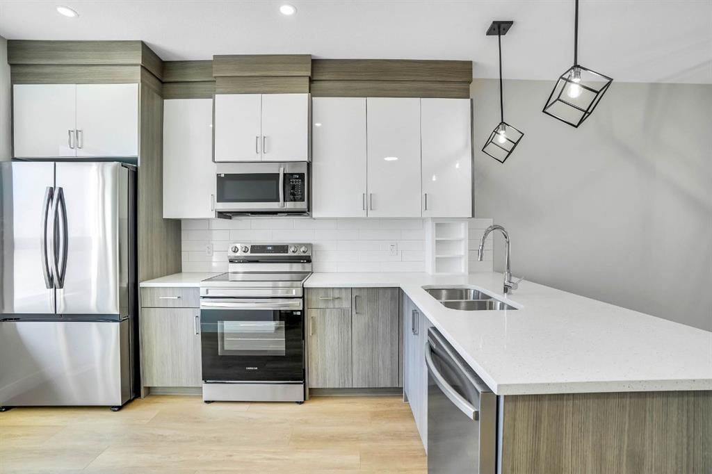 Welcome to this beautifully upgraded corner unit townhouse in the desirable community of Redstone! This stunning 3 bed, 3.5 bath home offers an exceptional layout with thoughtful design throughout. As you enter, you’re greeted by a spacious foyer leading to a main level bedroom with a full ensuite ideal for guests, extended family, or a private office space. You’ll also find access to the attached garage and a separate rear entrance for added convenience. The second floor boasts an open-concept layout featuring a stylish kitchen with stainless steel appliances, a large island perfect for bar stools, and a bright living/dining area that opens onto a private balcony perfect for summer BBQs. A 2-pc bathroom is also conveniently located on this level. Upstairs, enjoy upgraded railings, a dedicated laundry room, and a spacious hallway. The primary bedroom offers a walk-in closet and a full ensuite, while the generously sized second bedroom also features its own private ensuite perfect for added comfort and privacy. Located minutes from Stoney Trail, shopping, parks, and more, this turn key corner unit is the perfect place to call home. Don’t miss out, this one won’t last!