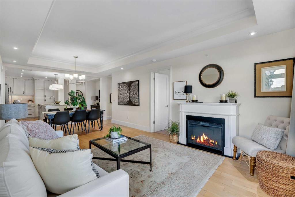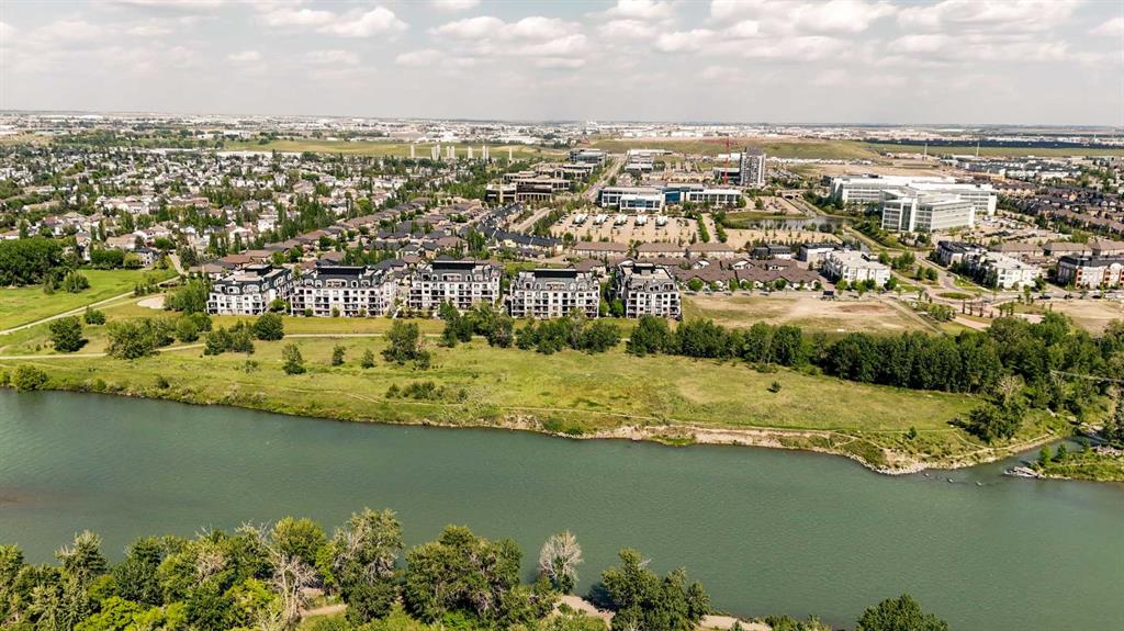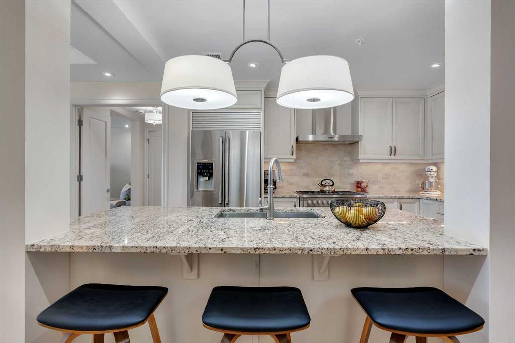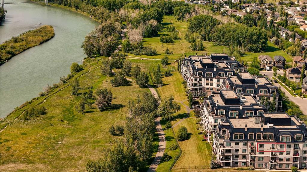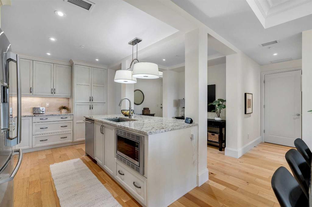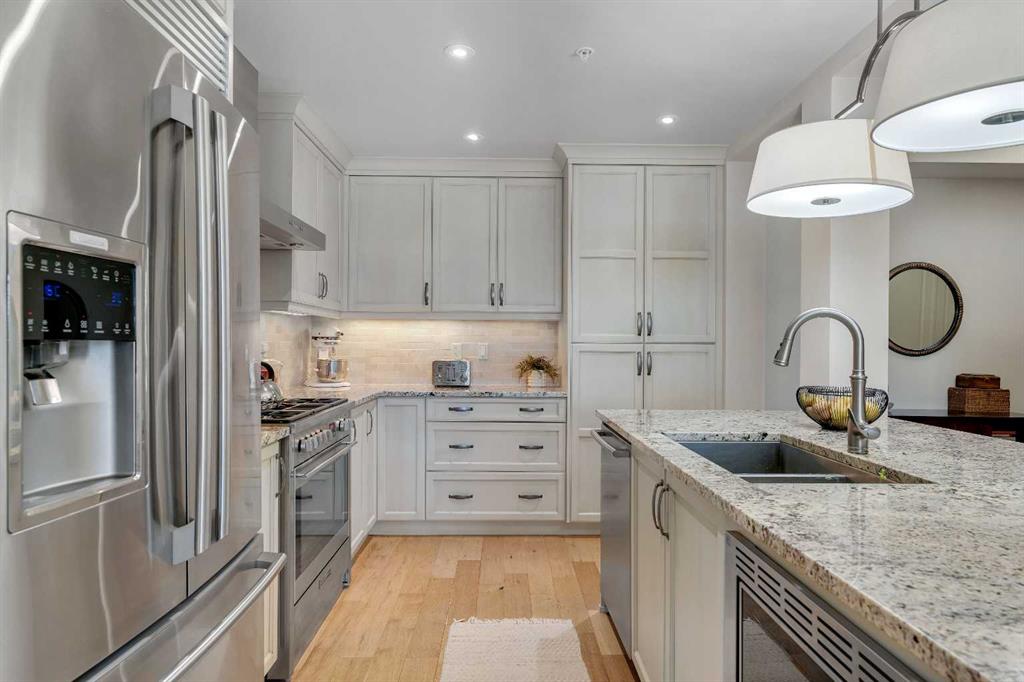 Experience luxury living in this spacious 2-bedroom plus den condo in the prestigious, concrete-built Champagne residence. Located on the fourth floor, this south-facing unit offers views of the Bow River to the west and over 1,250 sq ft of thoughtfully designed living space. The open-concept layout includes a beautiful gourmet kitchen featuring full-height warm white cabinetry, granite countertops, a large island with seating, and high-end stainless steel appliances including a gas range. The kitchen flows effortlessly into the dining area and bright, airy living room, where large windows and a patio door open onto a private balcony with a gas hookup.