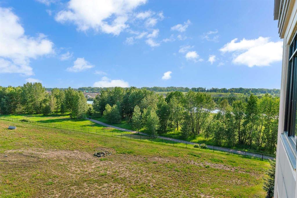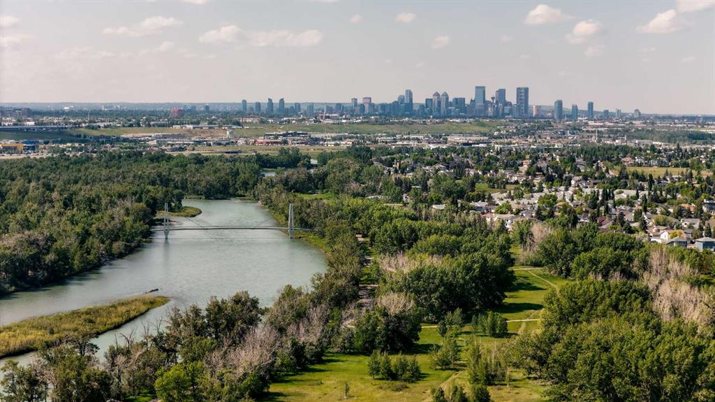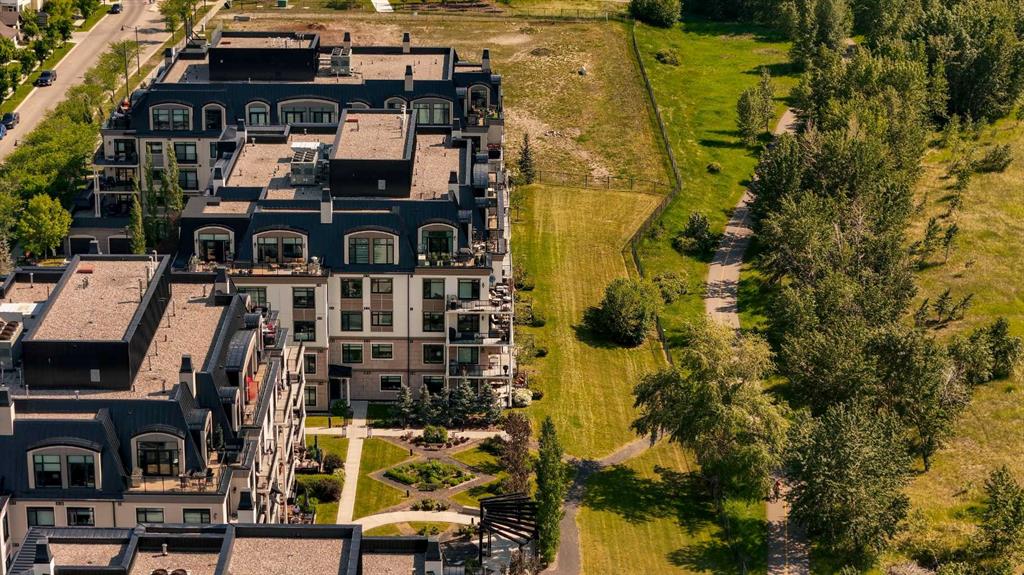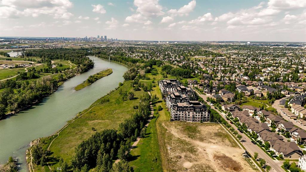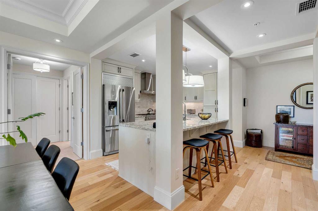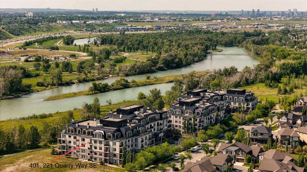 Experience luxury living in this spacious 2-bedroom plus den condo in the prestigious, concrete-built Champagne residence. Located on the fourth floor, this south-facing unit offers views of the Bow River to the west and over 1,250 sq ft of thoughtfully designed living space. The open-concept layout includes a beautiful gourmet kitchen featuring full-height warm white cabinetry, granite countertops, a large island with seating, and high-end stainless steel appliances including a gas range. The kitchen flows effortlessly into the dining area and bright, airy living room, where large windows and a patio door open onto a private balcony with a gas hookup.