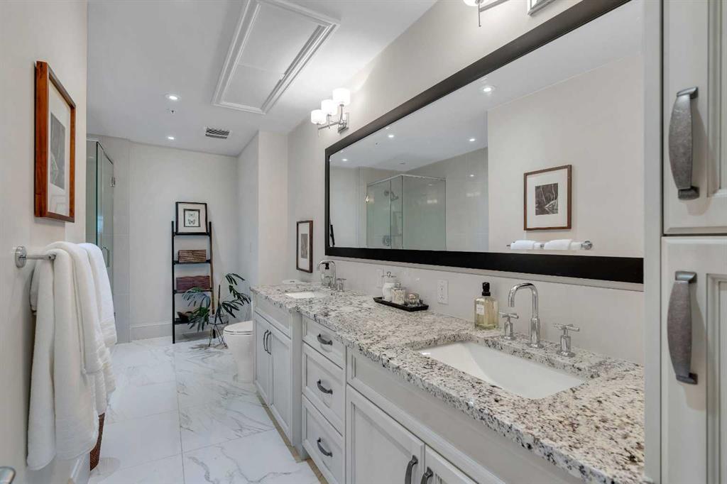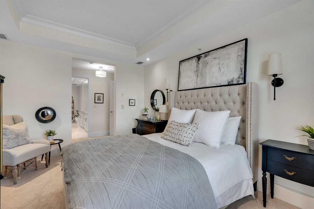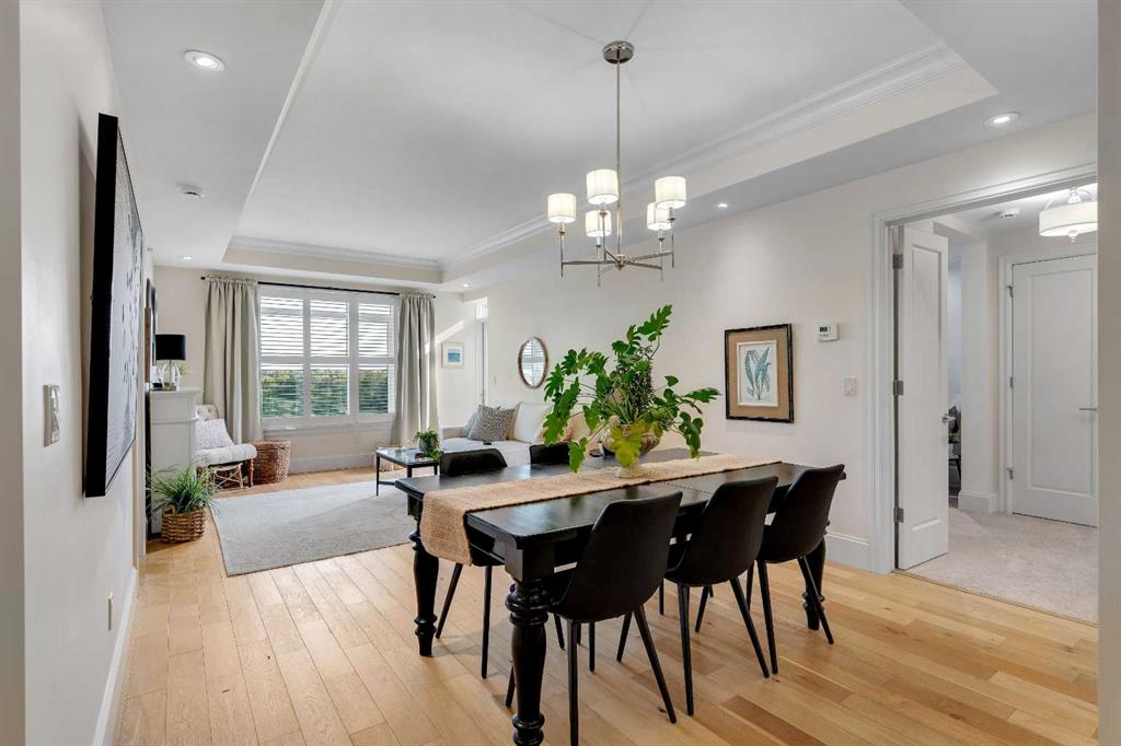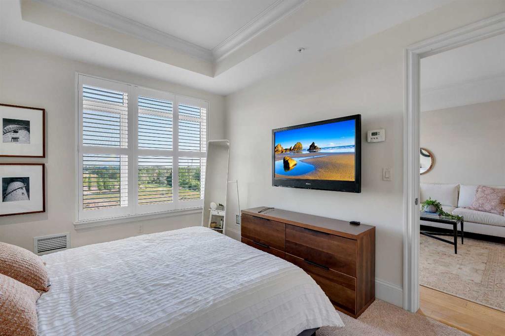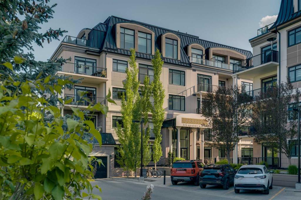 The expansive primary suite easily accommodates a king-sized bed and additional furniture, and includes a walk-in closet and a luxurious 5-piece ensuite with double sinks, a soaker tub, and a glass-enclosed shower. A second bedroom is positioned on the opposite side of the unit for added privacy and is adjacent to a stylish 4-piece bath. The separate den makes an ideal home office or flex space. Additional features include wide plank hardwood flooring throughout the main living areas, tray ceilings with pot lighting in the dining and living rooms, central A/C, and upgraded window shutters. This unit also includes a titled oversized underground parking stall and a titled storage locker. Champagne is a pet-friendly, exceptionally maintained building offering amenities such as a two-bay car wash, secure bike storage, and ample visitor parking. The location is unbeatable—just steps from the Bow River pathway system, Carburn Park, Sue Higgins Park, and all the amenities of Quarry Park, including the YMCA, shops, restaurants, and more. With quick access to major routes, commuting is easy and convenient. Don’t miss out on this opportunity!