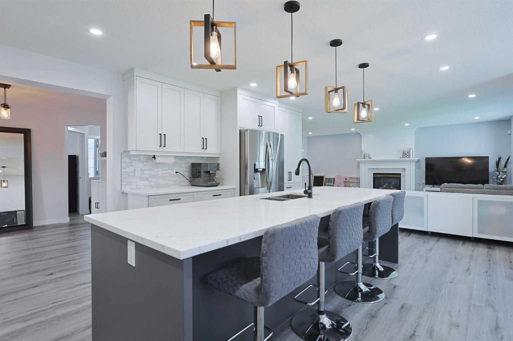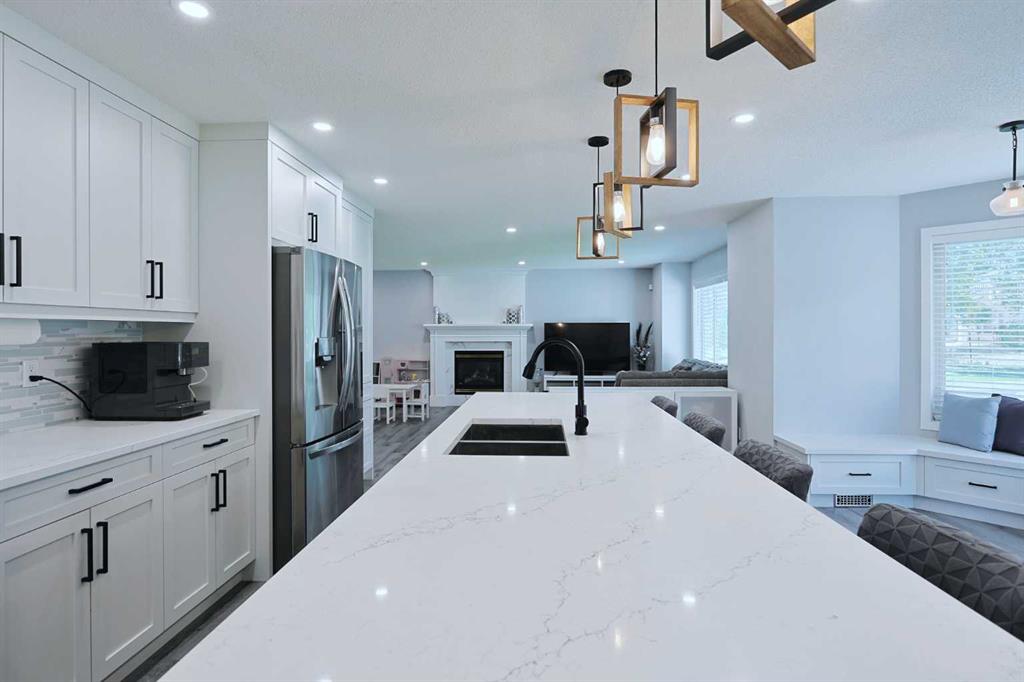 Knocking it out of the park is this beautifully renovated home tucked away in this quiet cul-de-sac in the highly-desirable golf course community of the Hamptons. Built by Sundance Homes, this extensively upgraded two storey enjoys vinyl plank floors & central air, total of 5 bedrooms + den, stunning designer kitchen with granite countertops & some of the improvements include interior paint & lighting, bathrooms, appliances & all polyB piping replaced with PEX. Wonderful family home featuring an expansive living room with gas fireplace & large picture window, separate formal dining room, breakfast nook with built-in seating & dedicated home office. The sleek new kitchen is a sight-to-behold, with its oversized central island & soft-close custom cabinetry, tile backsplash & stainless steel appliances including Fulgor Milano convection oven, Dacor gas cooktop & Bosch dishwasher. Upstairs on the 2nd floor are 3 terrific bedrooms & 2 full bathrooms, highlighted by the owners’ retreat with walk-in closet – complete with built-in organizers, & gorgeous ensuite with heated floors & free-standing soaker tub, granite-topped double vanities & oversized shower. Between the bedrooms is the open concept landing with 2 skylights & multi-purpose loft area…ideal as a lounge/sitting room, play area for the kids or study. The lower level – with high ceilings, is finished with 2 bedrooms, large rec room, storage room & renovated bathroom. Main floor laundry/mudroom with LG washer & dryer, built-in lockers, sink & granite countertops. Completed in the fall of 2021, among the extensive renovations: granite counters, kitchen & laundry room (including the appliances), interior paint & lighting, baseboards & interior doors, PEX piping, all the bathrooms & vinyl plank floors on the main & 2nd floors. Almost 8,000sqft pie lot…fully fenced & landscaped, complete with underground sprinklers, storage shed & deck with natural gas line for your BBQ. Truly incredible home here in this prime location within walking distance to the Hamptons School & bus stops, just minutes to the golf course & all neighbourhood amenities, shopping at the Hamptons Co-op & Edgemont Superstore plus quick easy access to schools & parks, major retail centers & hospitals, University of Calgary & downtown.