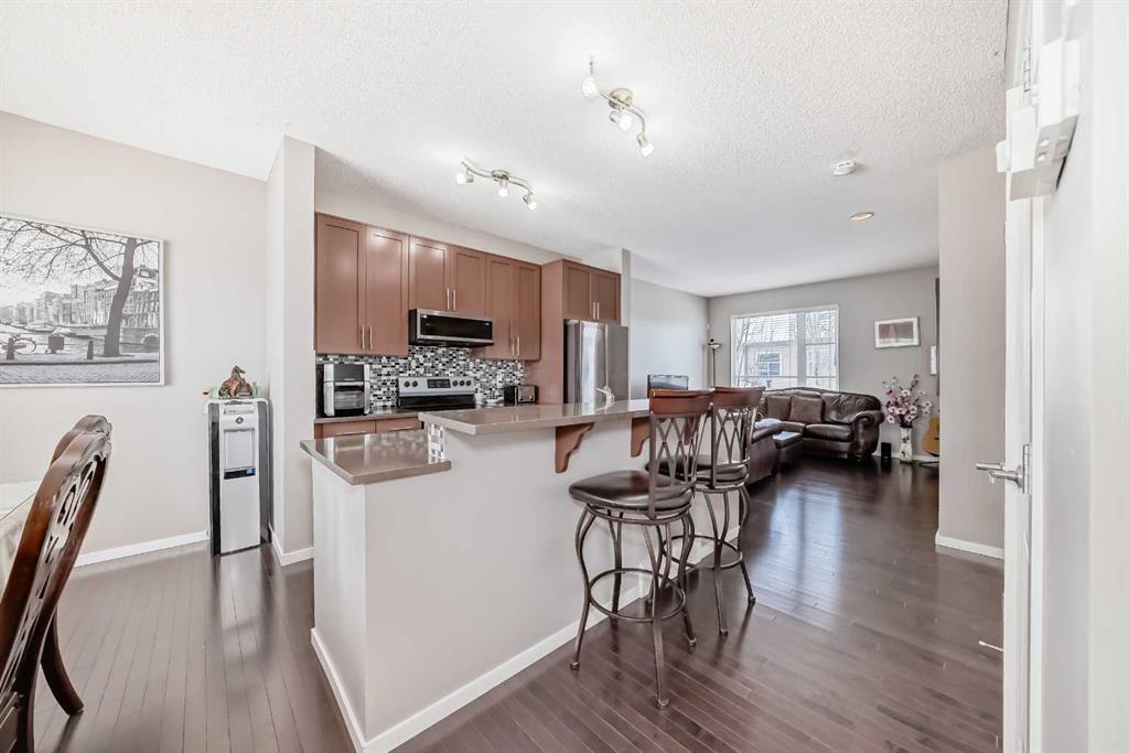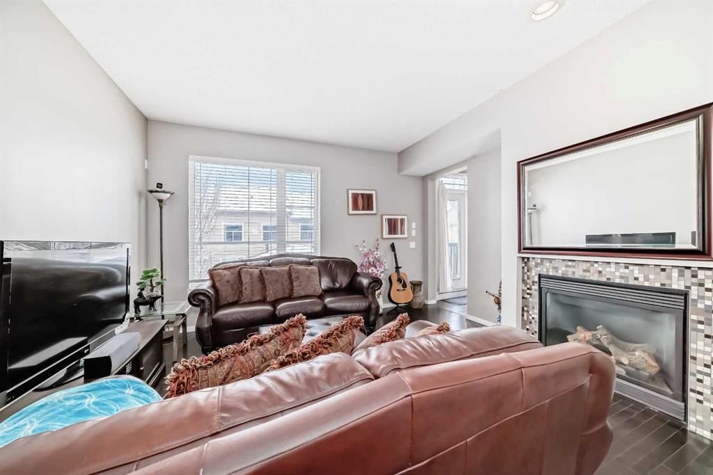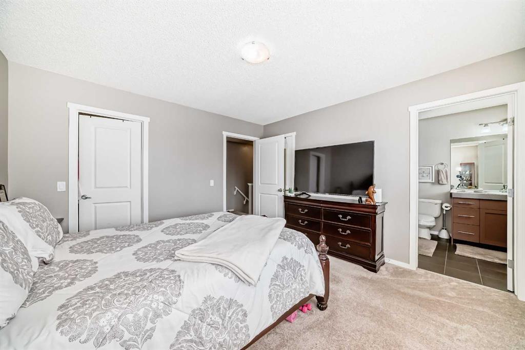 WELCOME TO THIS REALLY NICE TOWNHOUSE IN THE COVETED AREA OF CHAPARRAL. TWO PRIMARY BEDROOMS WITH ENSUITES, DBL GARGE ( RARE) FRONT PATIO AND BALCONY, FINISHED PARTIAL BASEMENT, AND MANY UPGRADES. This beautiful townhome features an open-concept, sleek design and finishes, with a modern look. Walking in, you will appreciate the hardwood flooring and big windows that let natural light stream in, along with newer blinds. The kitchen has SS appliances featuring a large double-door refrigerator with water, Quartz counters and a large Island that seats 4. The living room has a cozy gas fireplace for you to warm up to on those cold winter evenings. There's a mudroom-type area that leads to a door onto the balcony. Completing this floor is a 2-piece bathroom. Upstairs, YOU'LL NOTICE THE NEWER CARPET (2023), and the rare 2 bdrms, both with en-suites and walk-in closets. The laundry room is also on the upper floor for convenience. This is ideal for extended families or roommates. Downstairs is a partially finished basement with a flex space and roughed-in for a bathroom. What sets this property apart from the others is the double garage, as most in this complex only have a single garage. Also, you will love the front patio with a gas BBQ hookup. Low condo fees, $412 a month. Theres plenty of storage and off-street parking, close proximity to shopping, restaurants, schools, public transportation and of course the all season lake which offers all types of outdoor activities, and recreation facilities. Don't miss this chance to own a fabulous new home.