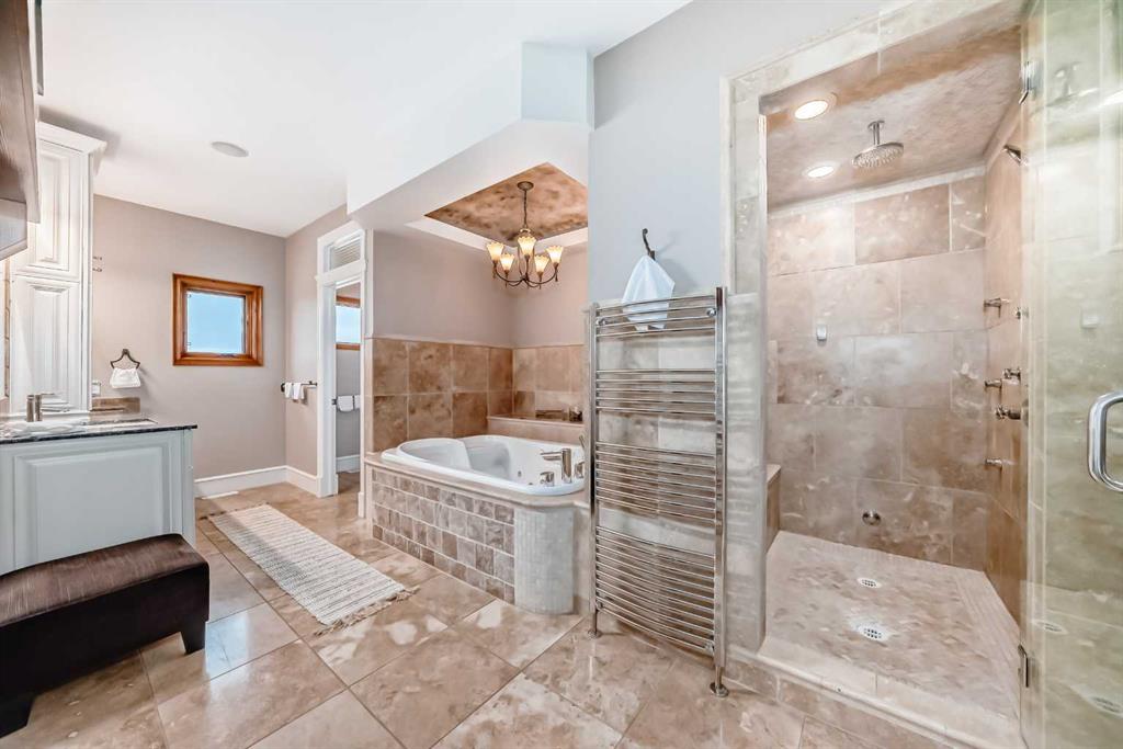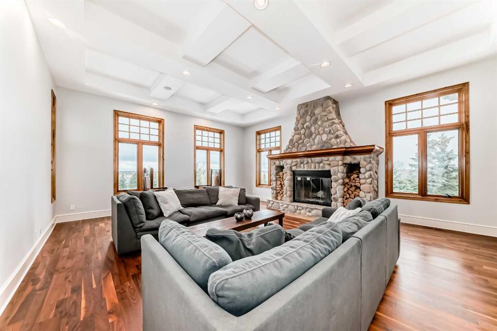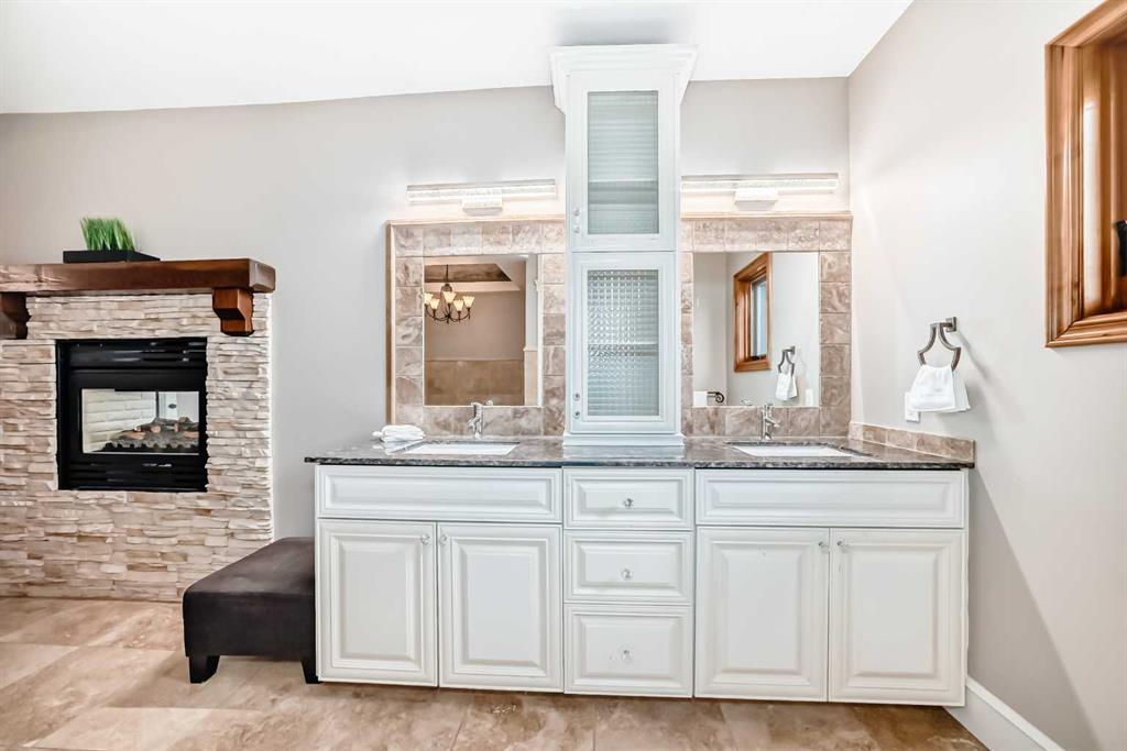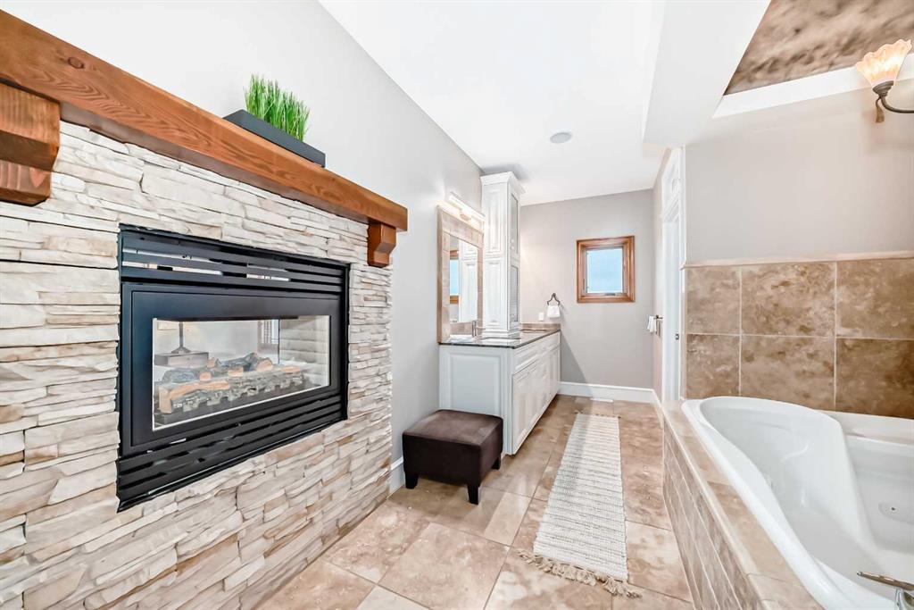 Built with efficiency in mind, the home features triple-pane windows and R35 insulated walls, contributing to strong overall energy performance and low energy bills. The upper level includes a well-appointed primary suite with a see-through natural stone wrapped fireplace showing through to the 6-piece ensuite, which features a spacious walk-in closet, a double-width jetted tub, and a full body shower/two-person steam room. Three additional bedrooms, a 5-piece bathroom, and a full laundry room with a sink and Bosch appliances complete the main-upper level.
