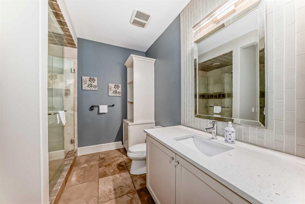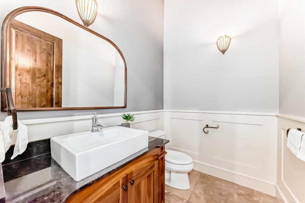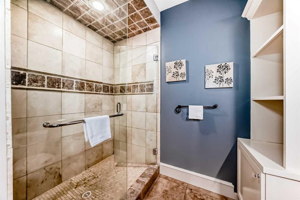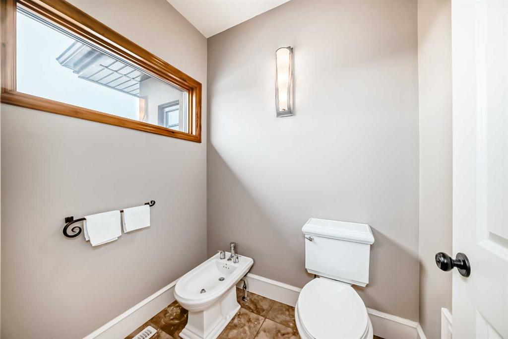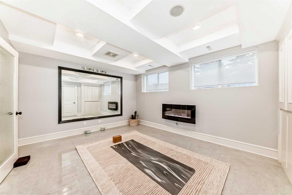 Built with efficiency in mind, the home features triple-pane windows and R35 insulated walls, contributing to strong overall energy performance and low energy bills. The upper level includes a well-appointed primary suite with a see-through natural stone wrapped fireplace showing through to the 6-piece ensuite, which features a spacious walk-in closet, a double-width jetted tub, and a full body shower/two-person steam room. Three additional bedrooms, a 5-piece bathroom, and a full laundry room with a sink and Bosch appliances complete the main-upper level.