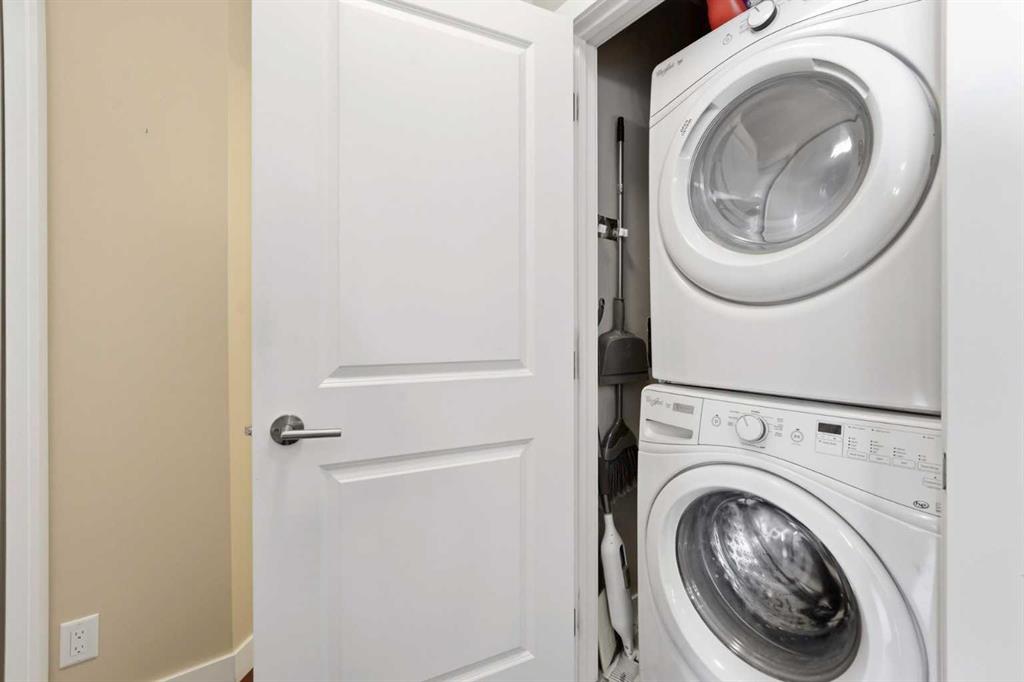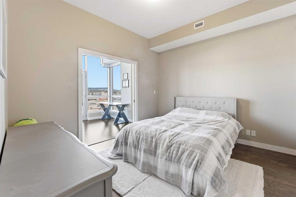 Perched on an upper floor in the highly sought-after community of Varsity Estates, this modern 1 bedroom plus den condo offers an open-concept layout in a CONCRETE BUILDING, providing excellent soundproofing and long-term durability. The space is enhanced by impressive 10-FOOT CEILINGS and FLOOR-TO-CEILING WINDOWS, allowing natural light to fill the home throughout the day. The spacious kitchen is designed for both everyday living and entertaining, featuring QUARTZ COUNTERTOPS, FULL-HEIGHT CABINETRY, STAINLESS STEEL APPLIANCES, and a generous breakfast bar that flows seamlessly into the living and dining areas. A versatile den with a pocket door provides the perfect HOME OFFICE or flex space for today’s lifestyle. The primary bedroom includes a walk-through closet with custom organizers and access to a spa-inspired bathroom complete with an OVERSIZED GLASS SHOWER and built-in bench. Comfort is elevated with CENTRAL AIR CONDITIONING, IN-SUITE LAUNDRY, TITLED UNDERGROUND PARKING, and an ASSIGNED STORAGE LOCKER. Residents also enjoy access to exceptional rooftop amenities, including a ROOFTOP FITNESS CENTER, STEAM ROOMS, OWNER’S LOUNGE, and an outdoor terrace with BBQs and mountain views. The location is incredibly convenient — just steps to cafes, restaurants, shops, and everyday amenities, with DALHOUSIE LRT, UNIVERSITY OF CALGARY, and MARKET MALL nearby. An excellent opportunity for first-time buyers, professionals, investors, or those looking to downsize without compromise while owning in a well-built concrete building in one of Calgary’s most desirable communities.