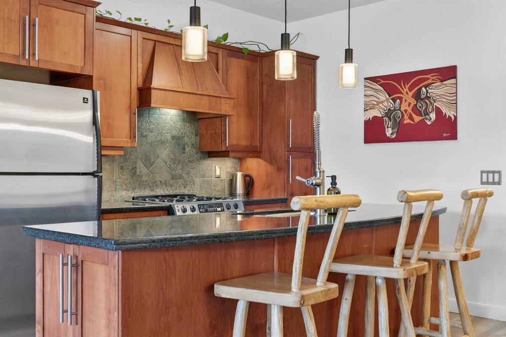 The living space is a standout, anchored by a stone-faced fireplace with a mantle that brings serious character. Big windows overlooking the balcony flood the room with natural light, and the open flow into the dining area makes it perfect for hosting or just enjoying everyday life. The kitchen delivers on both style and function with granite countertops, stainless steel appliances (including a gas range), and plenty of storage.