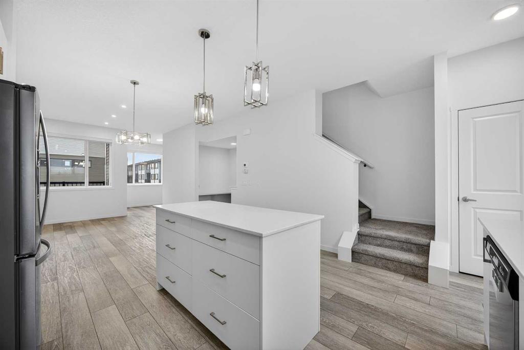 This sharp, like-new 3 storey townhome built by Shane Homes in the popular Corner Haven community in Cornerstone is move-in ready and packed with modern finishings. Featuring three spacious bedrooms, two full bathrooms and a 2 piece powder room, it greets you with neutral bright paint, durable vinyl plank flooring on the lower and main levels and even views of the majestic Rocky Mountains from the main and upper levels. Downstairs you’ll find a large sunny flex room with big windows, a generous entry closet, handy under-stairs storage, and direct access from the attached double garage. Extra street parking right out front is a nice bonus. The main level impresses with soaring 9 foot ceilings and a bright white kitchen that’s perfect for everyday living and entertaining. It offers quartz countertops, stainless steel appliances, tile backsplash, tons of cabinetry, and a large island with storage and pendant lighting. Flowing nicely are the dining area, breakfast nook, built-in workspace nook, and a convenient 2 piece bath. Outside, enjoy the covered private back balcony with a gas line ready for your BBQ, plus a handy front balcony right off the kitchen. Upstairs, the primary bedroom is a great size with a walk-in closet and a spa-like 3 piece ensuite featuring quartz countertop, luxurious tile floor and a beautiful tile surround walk-in shower. Two additional good sized bedrooms, upper level laundry, a linen closet, and a 4-piece bathroom with quartz countertop, vinyl plank floor and tile surround tub/shower round out this level. The building envelope and structural warranty are still in place, giving you extra peace of mind. Best of all, you’re just steps to shopping and great restaurants, parks, athletic fields, future schools and more. Also, quick access to YYC Airport, Country Hills Blvd & Stoney Trail. A fantastic home in a convenient location - don’t miss it!