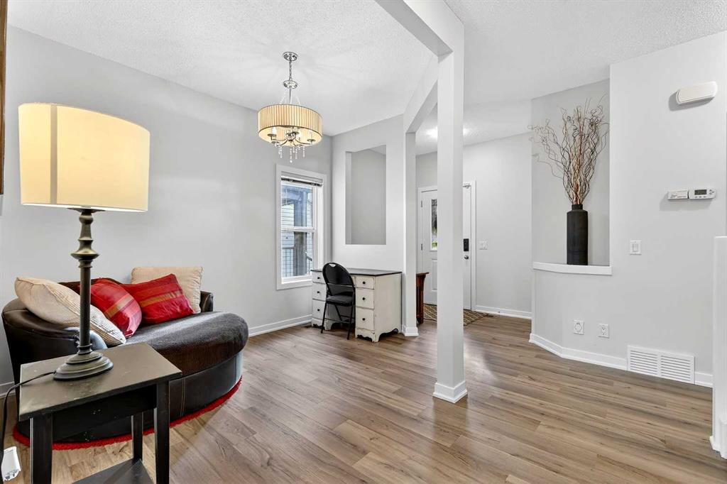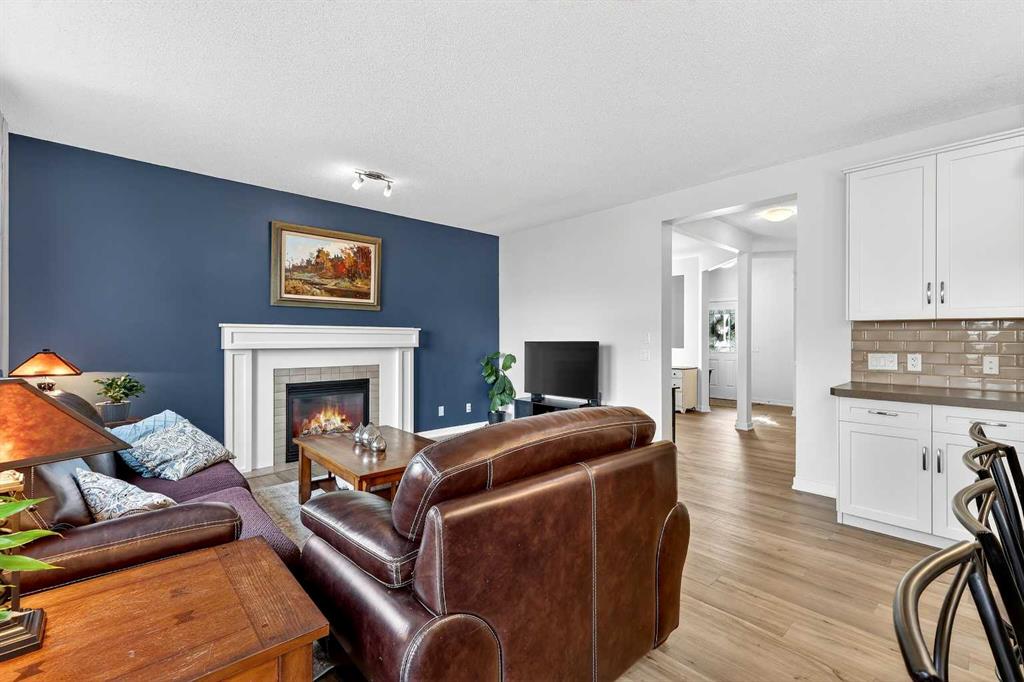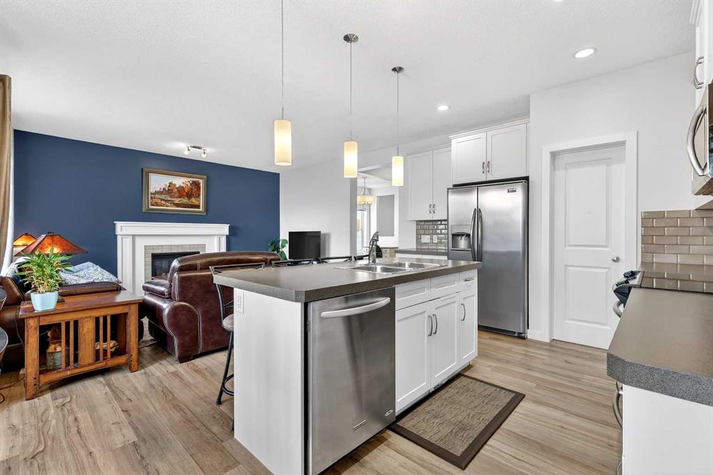 Offering three levels of developed living space, this home delivers exceptional flexibility and long-term value. The main floor features durable luxury vinyl plank flooring and a bright open-concept layout that seamlessly connects the kitchen, dining, and living areas — ideal for both everyday living and entertaining. The modern white kitchen is anchored by a large island, stainless steel appliances, and ample cabinetry. A front flex room provides versatility for a home office, formal dining space, or additional sitting area. The living room is warmed by a gas fireplace, creating a comfortable gathering space year-round.