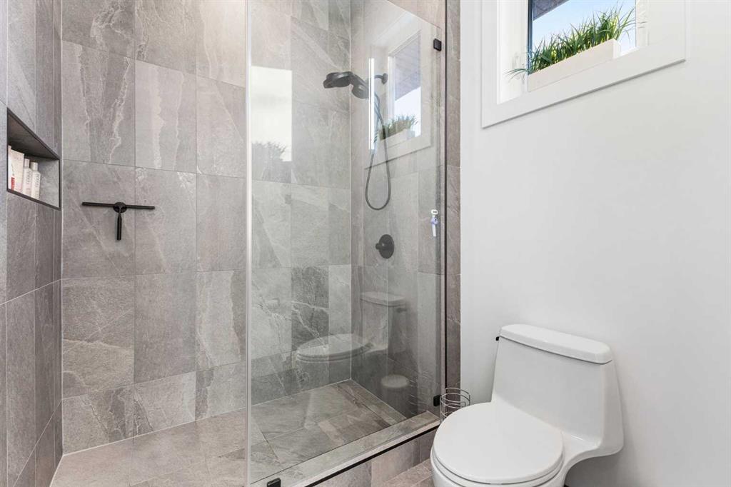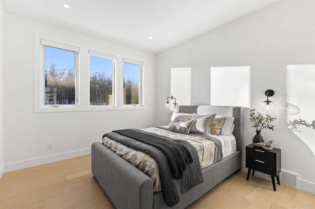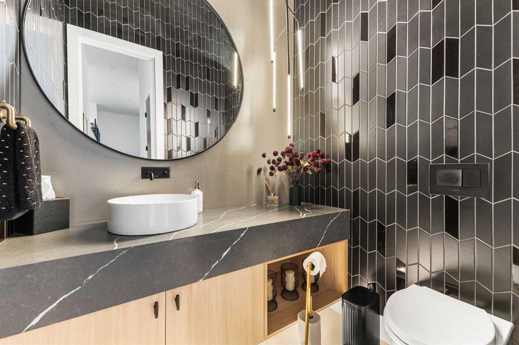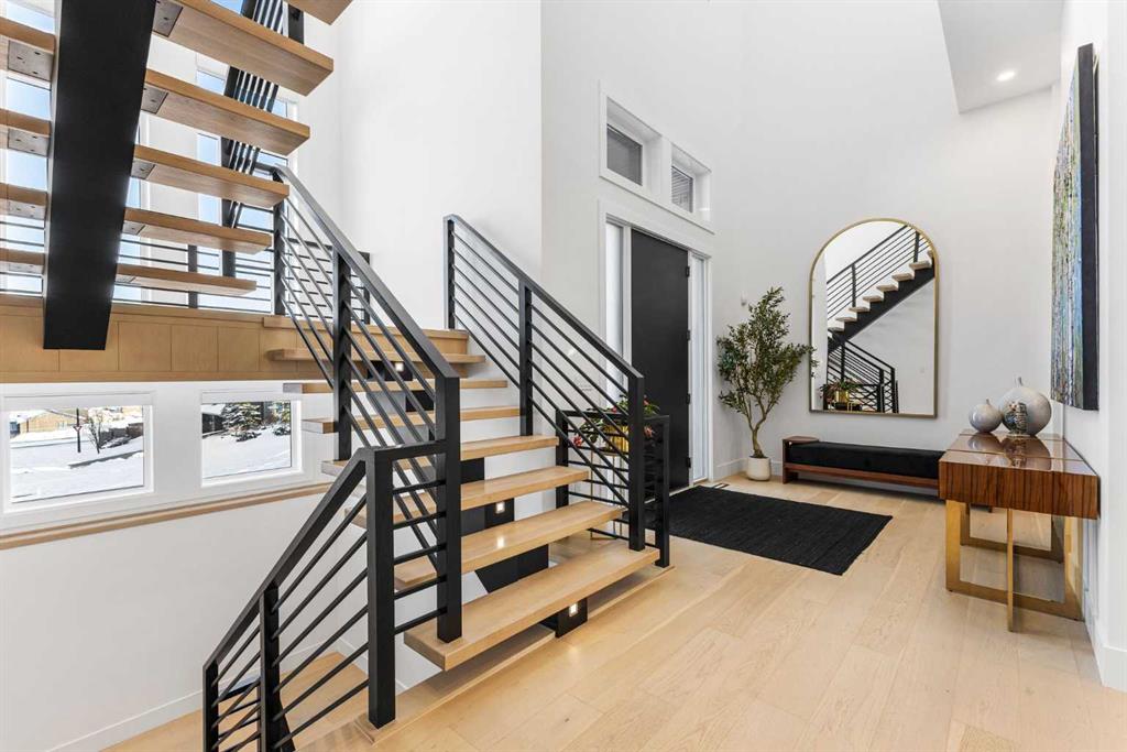 The main floor is built for real life and serious entertaining. The kitchen is expansive with a walk-in pantry and a servery right beside the dining room, making hosting seamless from start to finish. Two accordion doors open wide from the main living area directly to the deck and yard, making the transition from indoor to outdoor entertaining completely seamless. The living room is generous without feeling cavernous, and there's a proper main-floor office for those who work from home and need a space that feels like one. A main-floor bedroom with its own ensuite rounds things out beautifully ideal for guests, in-laws, or a nanny suite.