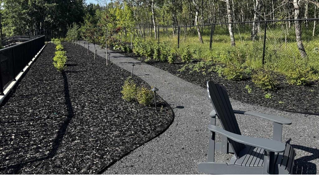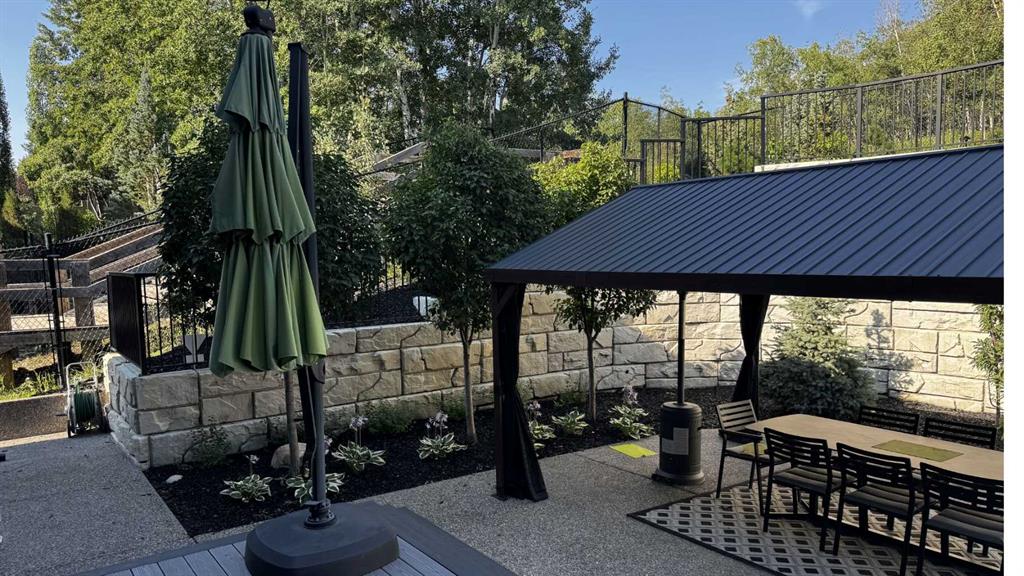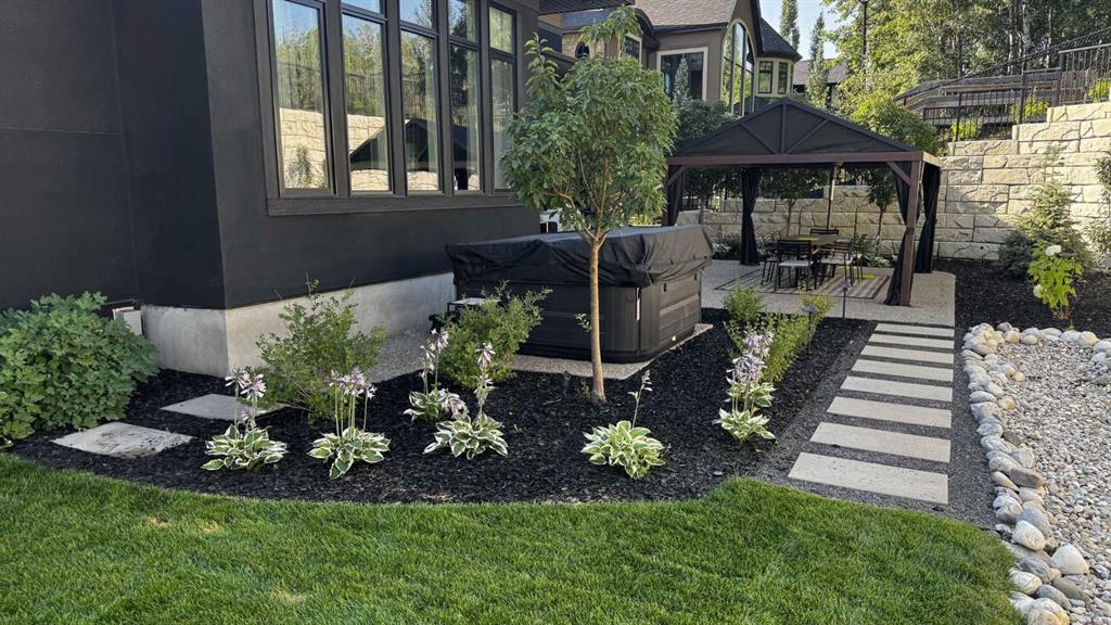 The outdoor space is something you don't expect until you see it. One of the largest lots in the community at a third of an acre, professionally landscaped and thoughtfully designed for how people actually spend their summers. Underground irrigation keeps everything lush without the effort. Gemstone lighting sets the mood after dark. A gazebo and dedicated firepit area give you every reason to stay outside long after dinner. The upper deck is gas-wired and ready for those evenings that stretch well past sunset. The yard is roughed in for a pool, and backing onto a treed community park means the privacy and greenery extend well beyond your property line.