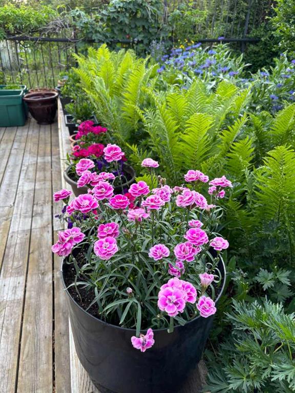 Step outside to a truly special backyard: two-thirds deck and one-third garden, designed in a beautiful English garden style with lush perennials, planters, and a cherry tree—your own private oasis.