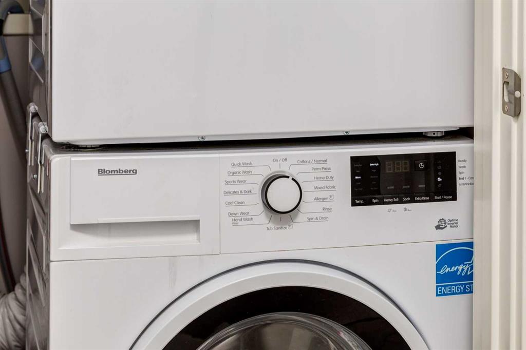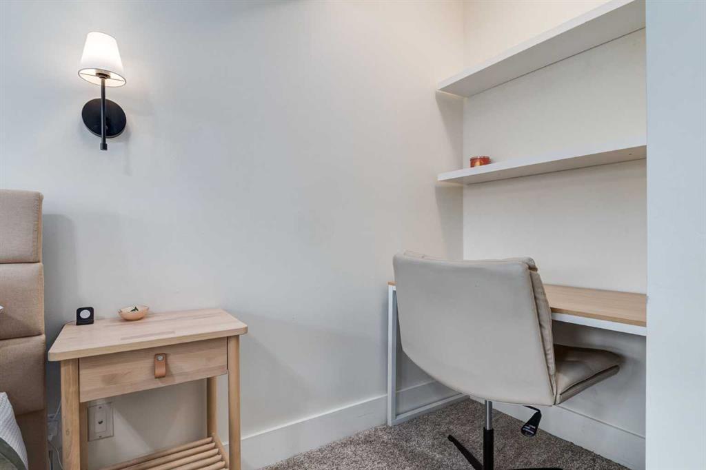 The well-appointed bedroom features a generous double closet along with a dedicated workspace nook—perfect for those working from home. A clean, modern four-piece bathroom, in-suite laundry, and premium Hunter Douglas window coverings add everyday comfort and practicality.