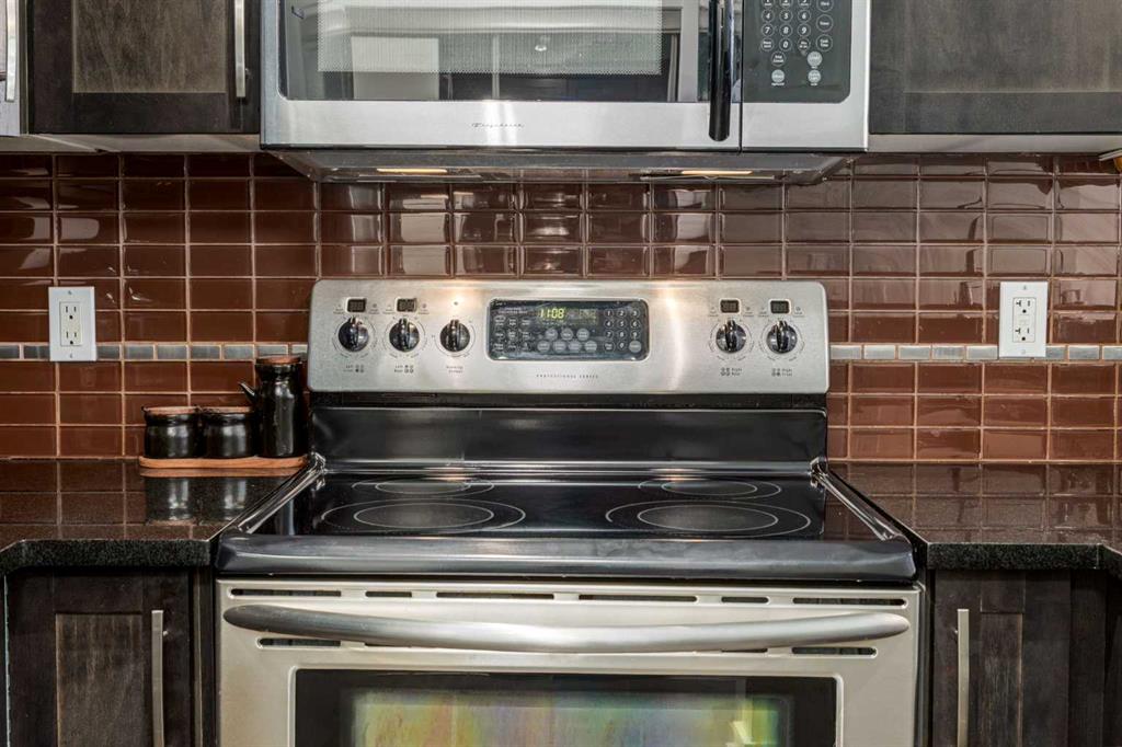 Spanning 582 sq. ft., the thoughtfully designed interior is flooded with natural light through expansive floor-to-ceiling windows and kept comfortable year-round with in-floor heating. The contemporary kitchen is both stylish and functional, showcasing rich maple cabinetry, polished quartz countertops, stainless steel appliances, and a versatile eating bar that’s perfect for casual dining or entertaining.