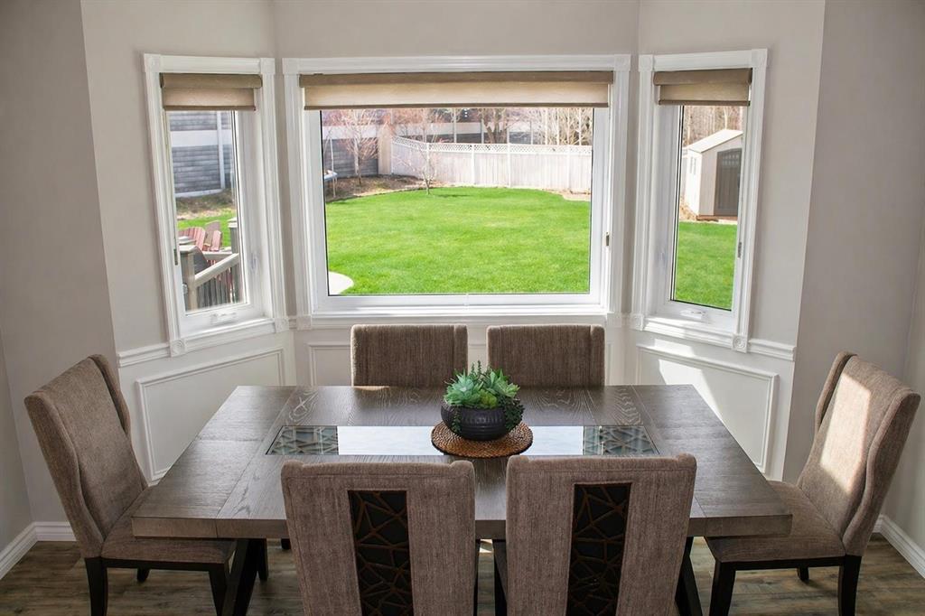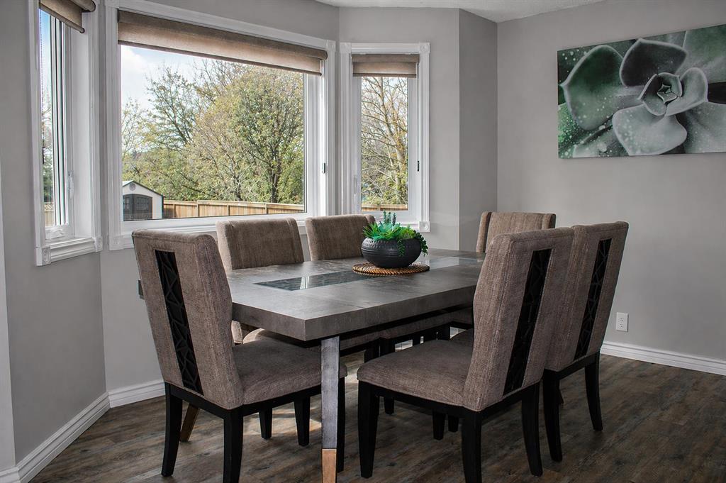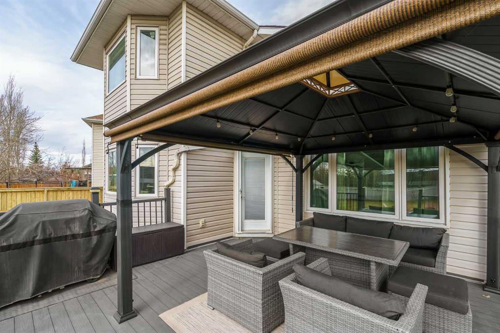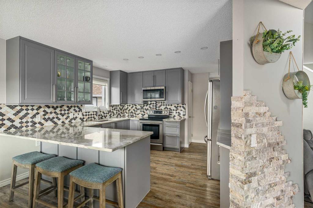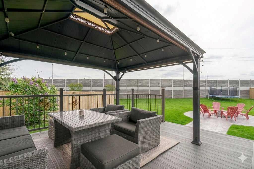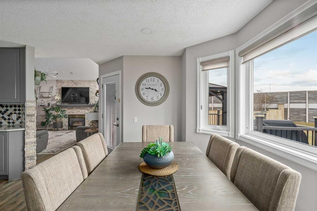 featuring a large composite deck with a gazebo, leading to a custom stamped concrete keyhole fireplace area perfect for entertaining or private relaxation. This property offers nearly 2,300 sq ft of fully developed living space, including a fully finished basement with a bedroom and ensuite. Inside, you’ll find a fully renovated kitchen that elevates the entire home. The living room welcomes you with a soaring vaulted ceiling and large windows, filling the space with natural light and creating an open, airy feel, anchored by a striking stone-faced fireplace feature wall. The dining area overlooks the expansive backyard, featuring a mature apple tree, beautifully maintained flower beds and raspberry bushes creating a peaceful and scenic setting.