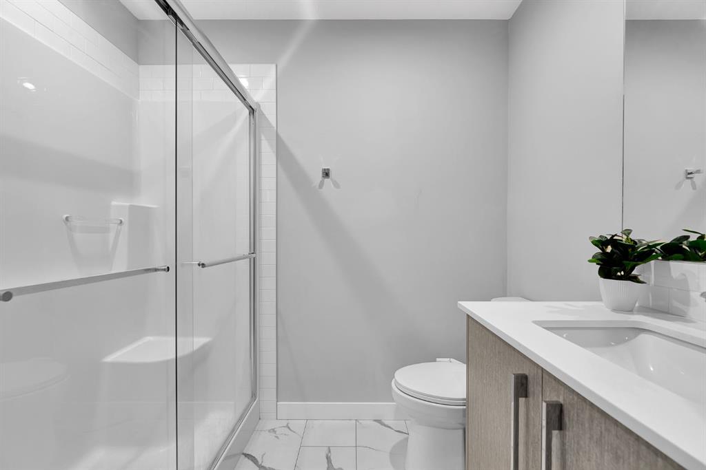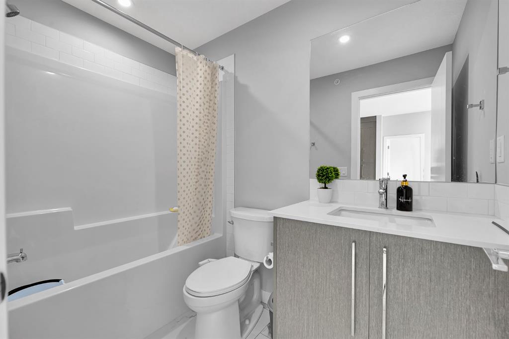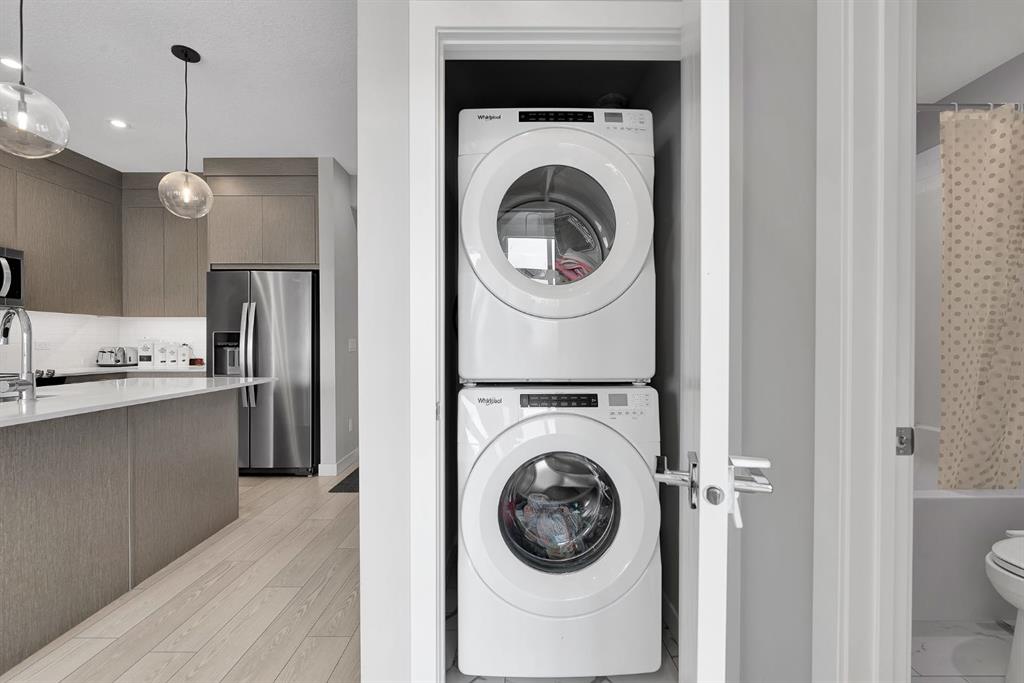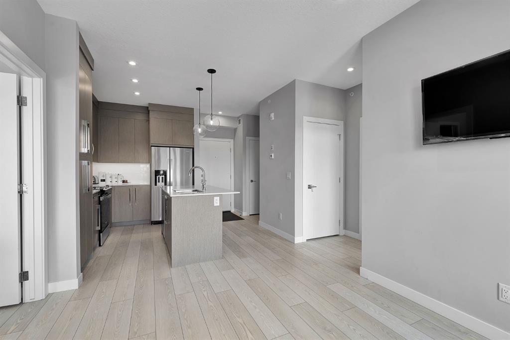 The modern kitchen is both stylish and functional, featuring sleek quartz countertops, stainless steel appliances, and ample cabinetry, perfectly designed for everyday living and hosting alike.