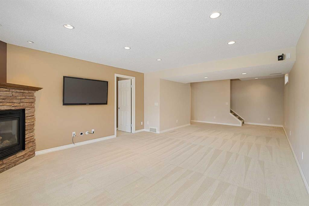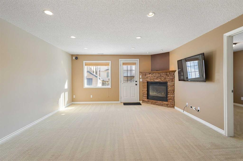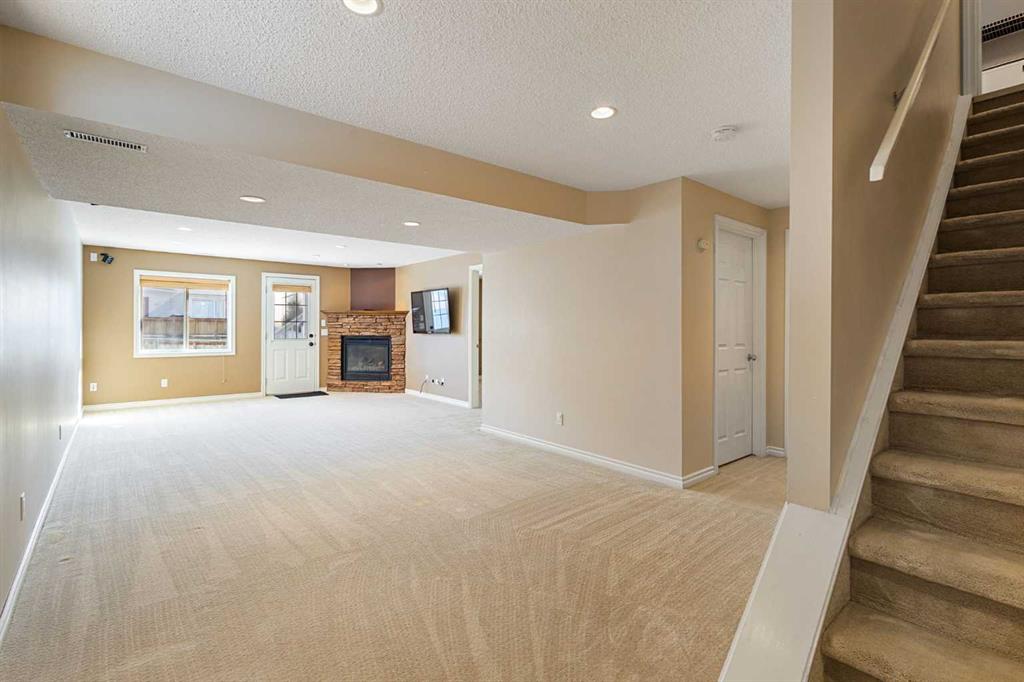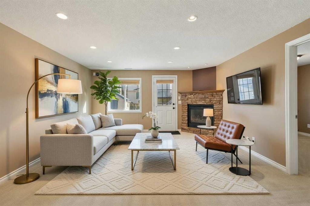 The walkout basement is fully developed and adds incredible flexibility with a large recreation room, gas fireplace, fourth bedroom, full bathroom with heated tile flooring, and additional storage space — ideal for guests or extended family.