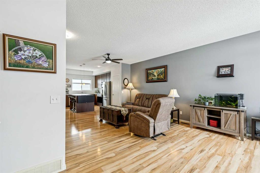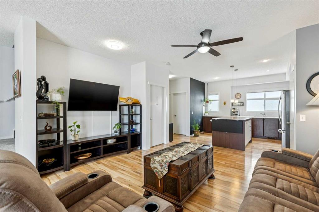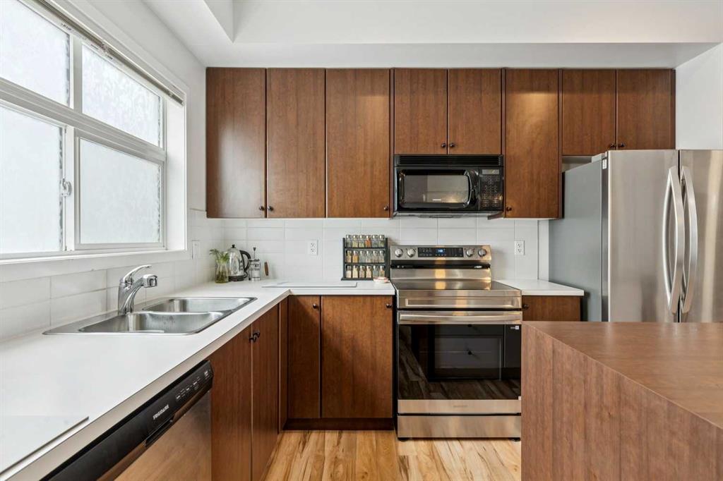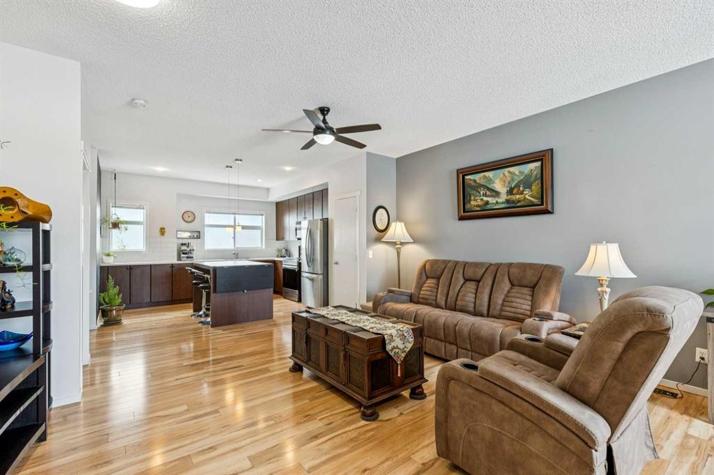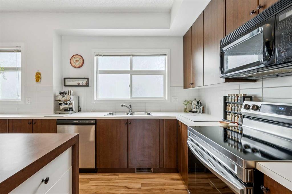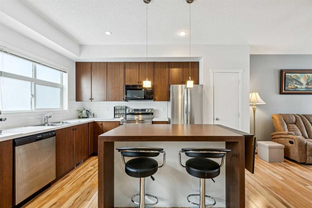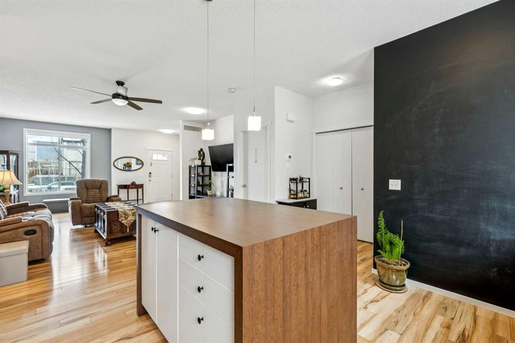 Meet “Emma” - End Unit | 2 Bed + Den | Double Attached Garage | Finished Basement - Meticulously maintained and ideally positioned as an end unit, this bright 2 storey townhouse offers a functional layout with thoughtful upgrades throughout. The open-concept kitchen is filled with natural light and features full-height cabinetry, an eating island with a counter space extender, a unique chalkboard wall, and updated appliances including a stove (2026) and fridge (2019). The spacious living area provides flexibility for both lounging and dining, complemented by ample storage with multiple cupboards and two pantries. A convenient 2-piece bathroom with added under-sink storage completes the main floor.