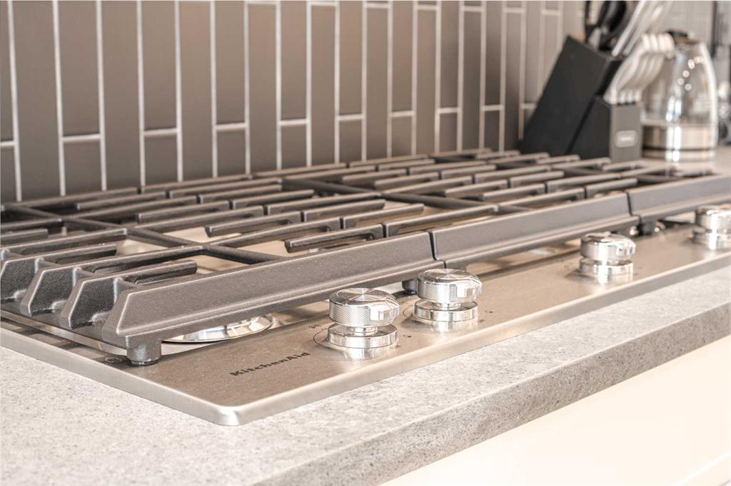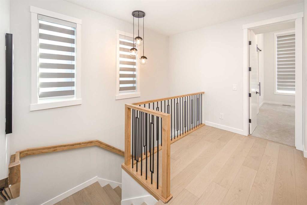 Upstairs continues with 9-ft ceilings, maintaining a consistent sense of space throughout. A versatile bonus room at the top of the stairs functions well as a secondary lounge, media area, or workspace. The primary suite is elevated by a vaulted ceiling, adding volume and a more luxurious feel to the retreat. The ensuite is thoughtfully designed with a double vanity, soaker tub, glass-enclosed shower, and in-floor heating, delivering everyday comfort during Calgary’s colder seasons. Two additional well-sized bedrooms, a full bathroom, and a conveniently located upper laundry room complete the level.