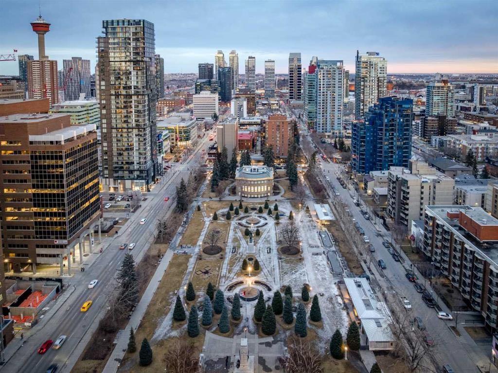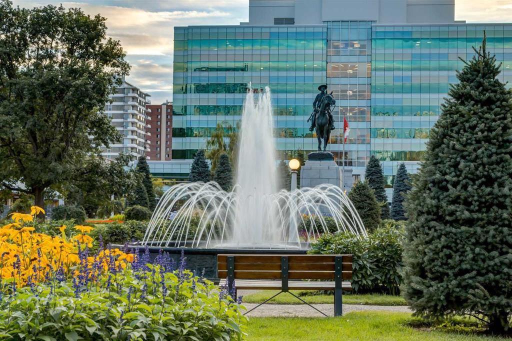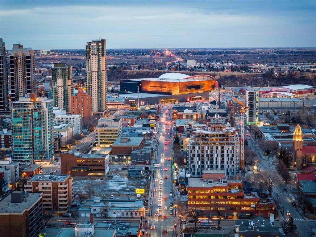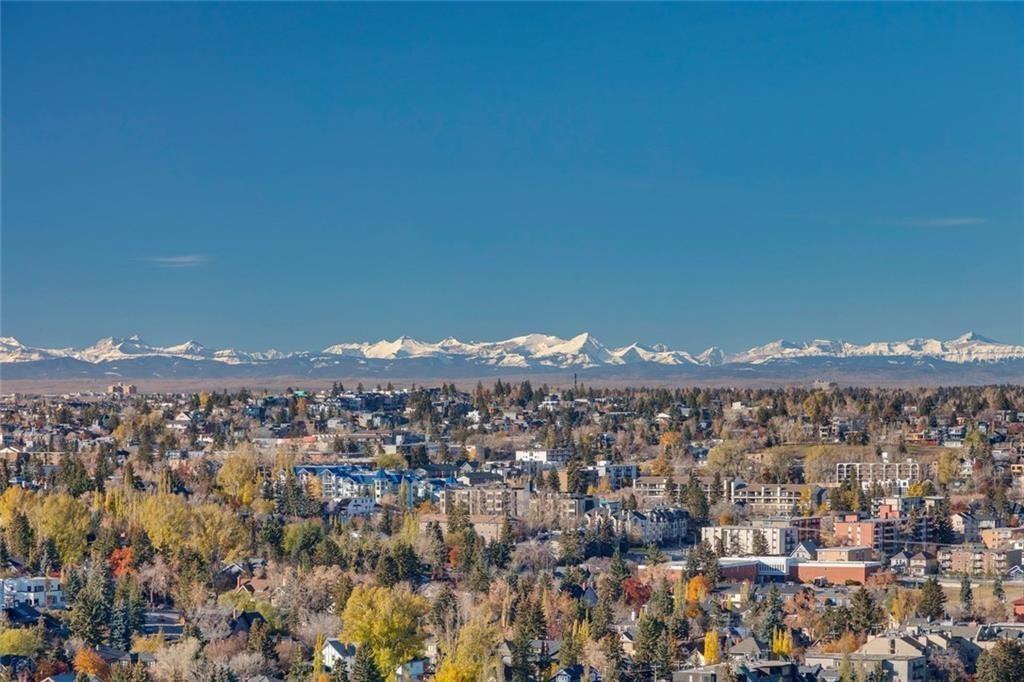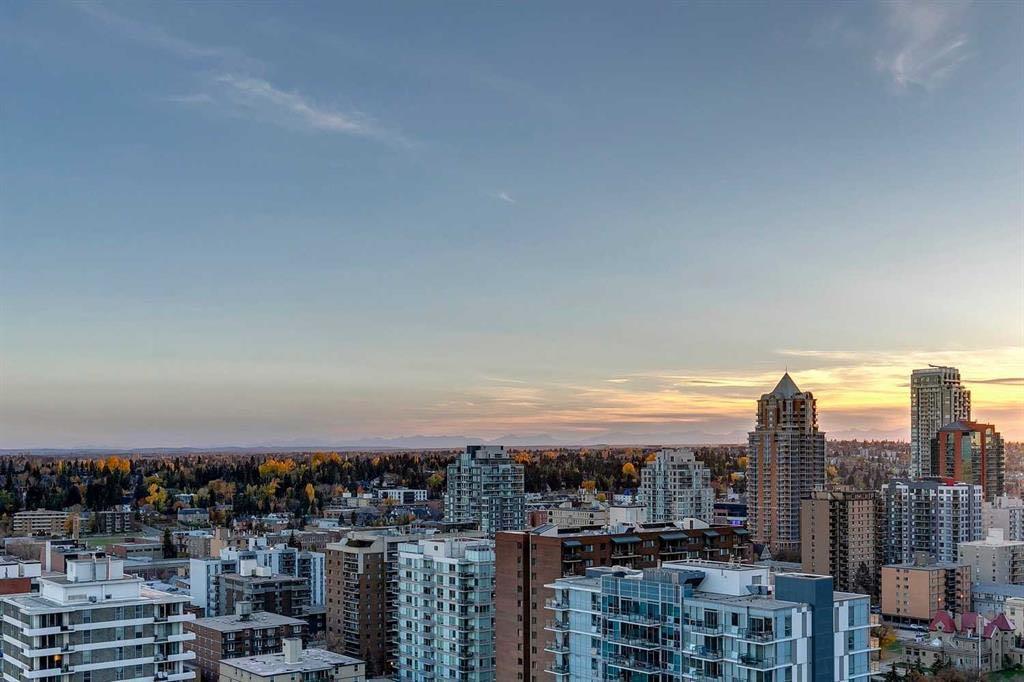 Welcome to this beautifully upgraded 13th-floor southwest corner residence in the Castello, offering ~1,200 sq. ft. of thoughtfully designed living space in one of Calgary’s most prestigious Beltline addresses. The corner position delivers natural light from multiple exposures, with sweeping mountain views to the west and inner-city views to the south. Only five units per floor in this quiet, concrete building – privacy and sound insulation are built in. The open-concept layout puts every square foot to work – no wasted hallway space. The kitchen features stainless steel appliances, granite countertops, soft-close cabinetry, a built-in wine bar, and updated lighting. Floor-to-ceiling windows and 9-foot ceilings with hardwood floors open directly onto the unit’s standout feature: a massive covered and Astroturfed wraparound patio of nearly 300 sq. ft. with natural gas hookup. Southwest-facing with prolonged sunshine, panoramic mountain and Beltline views, including direct sightline to the Stampede fireworks. The primary bedroom features a large walk-in closet with built-in organizers and a spa-inspired ensuite with 10 mm glass shower and dual vanity. The second bedroom includes a built-in desk and Murphy bed – home office by day, guest room by night. The main bath features upscale tile, fixtures, and hardware. Highlights: central A/C, in-suite laundry, Hunter Douglas honeycomb blinds, two titled heated parking stalls, and titled storage locker. Amenities: concierge, fitness centre, guest suite ($75/night), car wash bay, visitor parking, bike storage. Professionally managed and maintained. Pets are welcome. Steps from 17th Avenue, Stephen Avenue, restaurants, grocery, transit, and the downtown core. This is executive urban living – designed for professionals who want space, mountain views, and an unbeatable location.