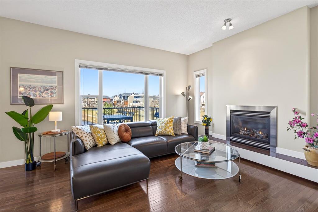 Inside, the home is filled with natural light from front to back. The front windows overlook the open square (no home directly in front of you), while the back of the home captures peaceful pond views. The living room features a gas fireplace and large windows, creating a cozy space to relax while enjoying the scenery.
