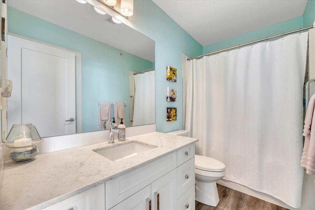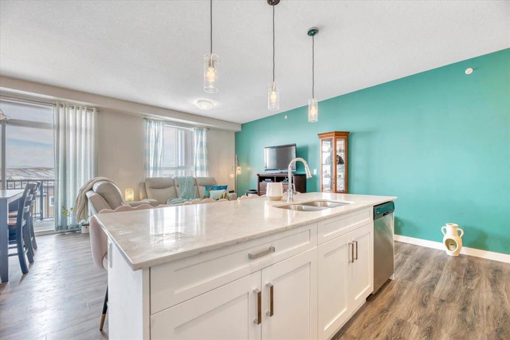 Welcome to this spectacular --Top-Floor Corner Penthouse home-- backing on to green space and offering over a 1000 Sq. Ft of stylish living space. Step inside your private retreat in the sky. This rare top -floor corner penthouse offers unmatched privacy, sweeping views with 16ft of balcony providing abundant space to enjoy morning sunrises and coffee rituals or your evening BBQ. You will love this corner unit with one shared wall, quietly located at the end of the hall, this home delivers the -peace and space- that condo buyers dream of. Inside, the residence features a spacious open-concept layout. The pristine white kitchen is equipped with elegant quartz countertops, stainless steel appliances, a full-size pantry, ample cupboard space, and a large island with a four-person breakfast bar, making it ideal for culinary preparation, entertaining guests, and hosting family gatherings. The open living space allows for flexible placement of furniture and an entertaining setup. The property is comprised of two well sized bedrooms. The primary suite is truly impressive: large enough for King size bed, framed by 10ft of walk-through close space, and connected to a beautiful en-suite with dual sink and built in linen closet. Your guests /roommate will love the thoughtful layout of the second bedroom and bathroom, connected by a pocket door for complete privacy. Everyday convenience continues with an in-suite laundry that is discreetly out of the way offering full-length shelving. The home is further enhanced with 10’x10’ storage locker located directly in front of your heated underground parking stall — ideal for bikes, skis, seasonal items…
