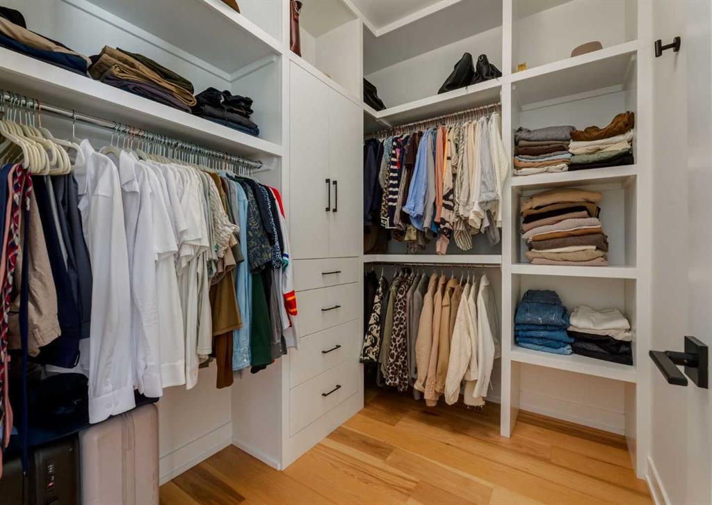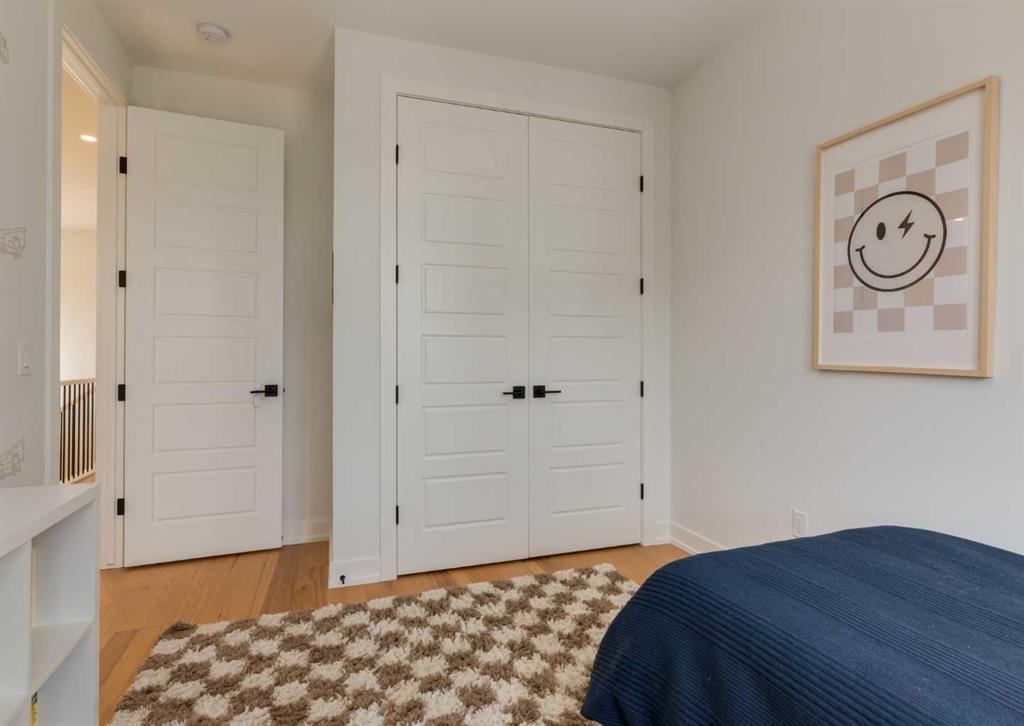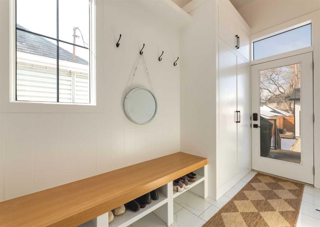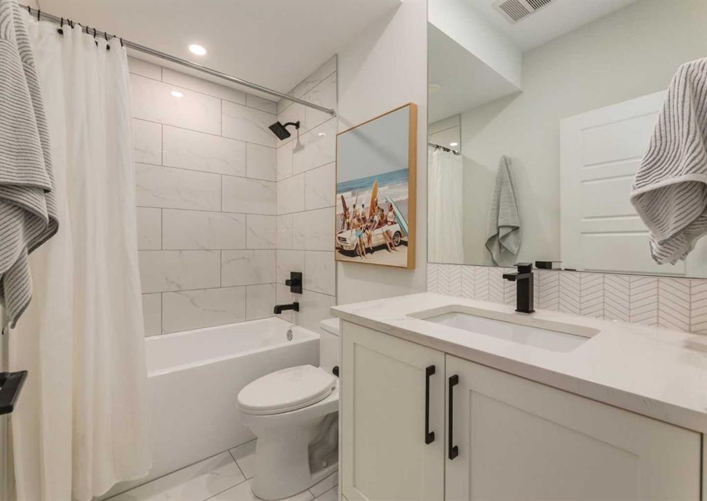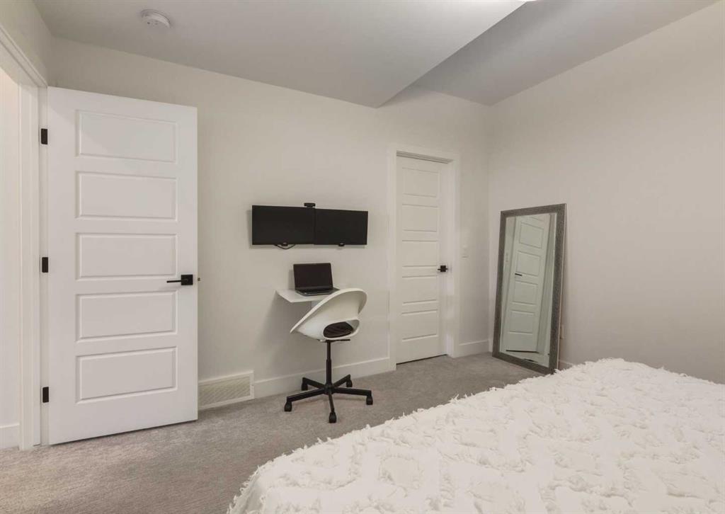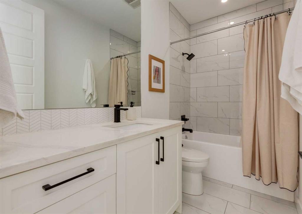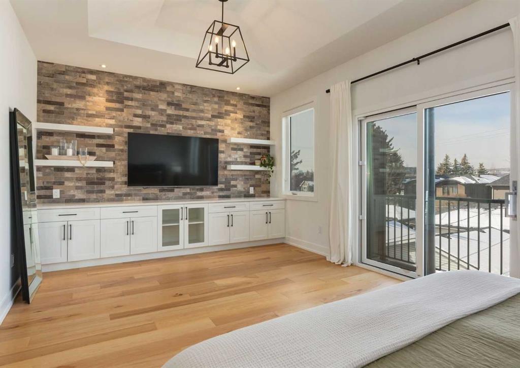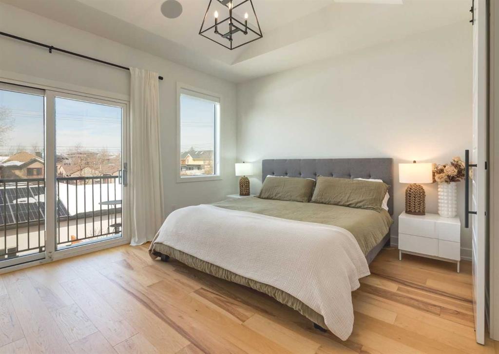 The upper level features three generous bedrooms, including a primary sanctuary with a private Romeo & Juliet balcony, vaulted ceiling, custom built-ins, and a spa-like 5-piece ensuite with heated floors, a deep soaker tub, and a walk-in shower. A dedicated laundry room with side-by-side machines, sink, and folding counter adds daily convenience.