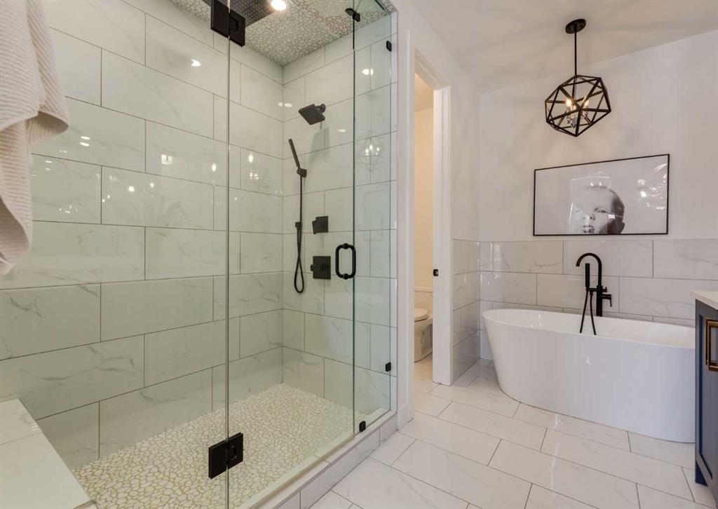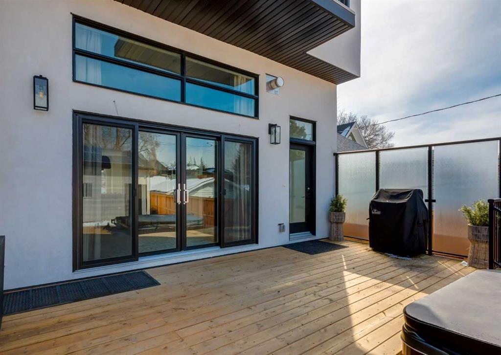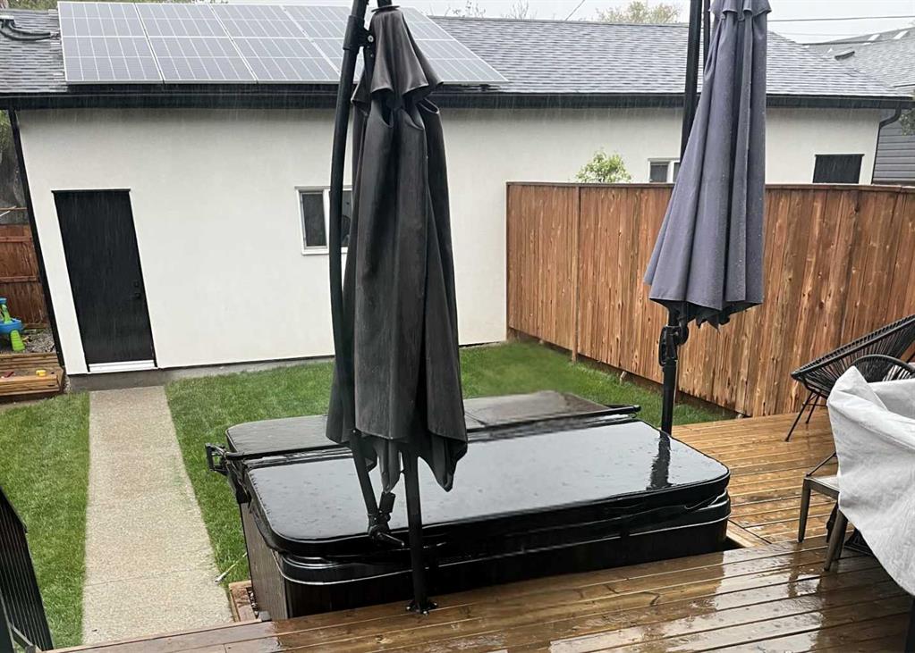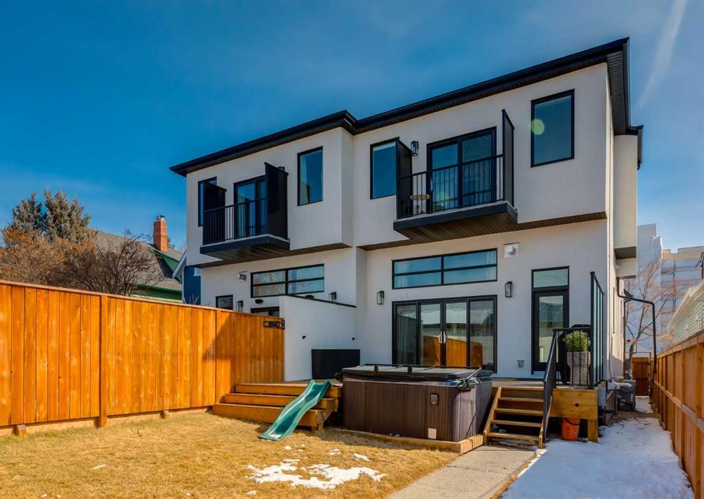 The front dining area overlooks a mature, established street, while the rear living room is defined by expansive 12’ ceilings, a brick fireplace, and rich oak hardwood flooring. Enjoy a seamless transition through sliding doors to your private, landscaped backyard. With a large WEST-FACING deck and a hot tub, this space is perfectly designed for summer evenings and entertaining.