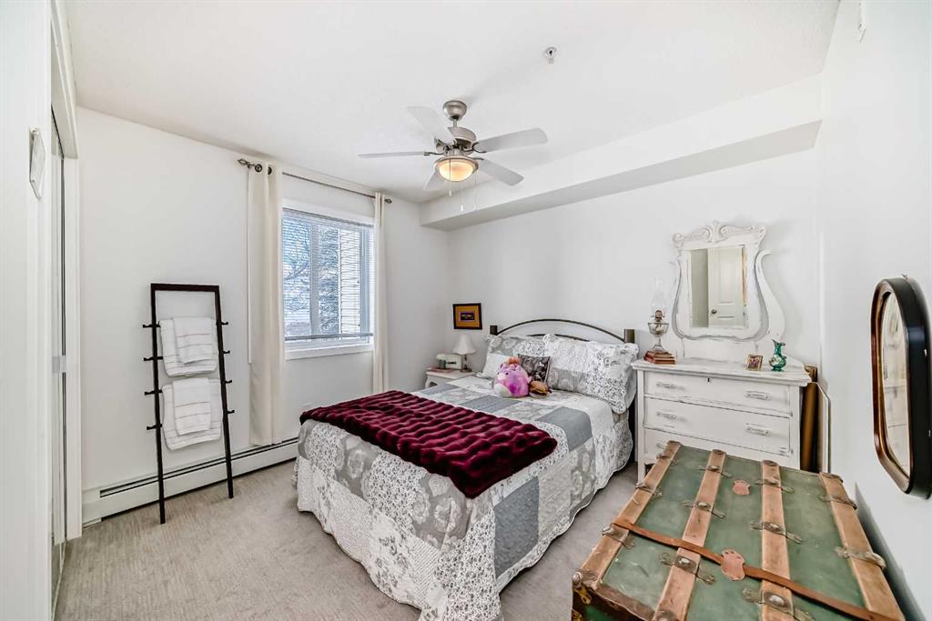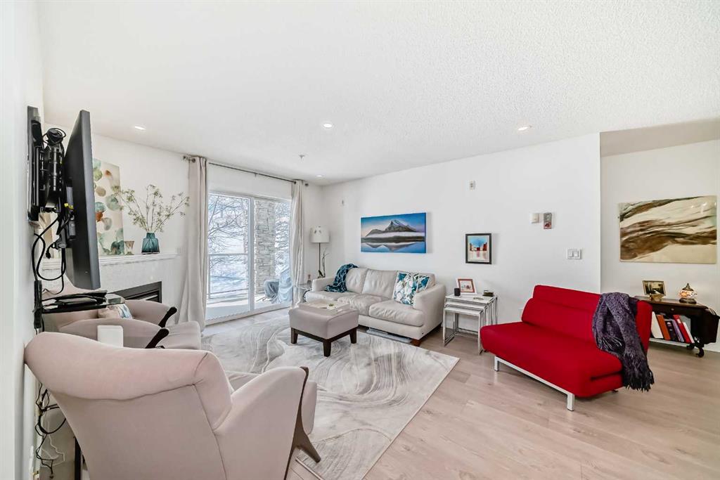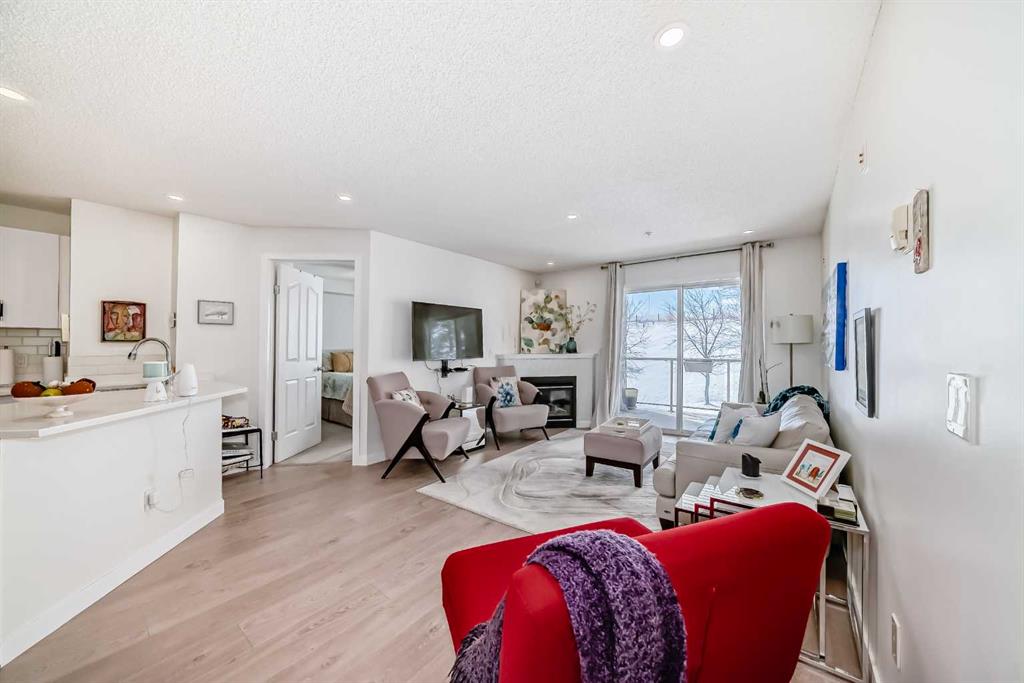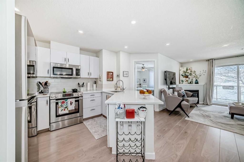 Welcome to this beautifully upgraded, quiet retreat that perfectly balances modern style with ultimate convenience. Situated with easy access to Stoney and MacLeod Trails, walking distance to the Somerset-Bridlewood C-Train station and the shops/services within the Shawnessy shopping district, this unit offers a peaceful sanctuary without sacrificing proximity to top-tier amenities. Step onto wide-plank laminate flooring in a warm, natural finish that flows throughout the open-concept layout. The heart of the home is a cozy living area anchored by a tiled surround gas fireplace. The entire space is bright and airy, illuminated by contemporary recessed lighting, modern light fixtures and natural West exposure. The stunning white kitchen is a masterclass in modern design, featuring chic black and brass pulls, durable, elegant quartz countertops, a full suite of S/S appliances, large workspace with an integrated sink and dishwasher. This split functional floor plan boasts 2 spacious bedrooms and 2 full bathrooms. The primary suite serves as a true escape, complete with an ensuite bathroom featuring a large walk-in shower. The second bathroom features a deep soaker tub. Additional features include a private balcony equipped with a gas BBQ hook-up. In suite washer, dryer and storage area PLUS a titled underground stall AND titled storage cage (a rarity in this building). Quiet, stylish, and perfectly located—this unit is a must-see!