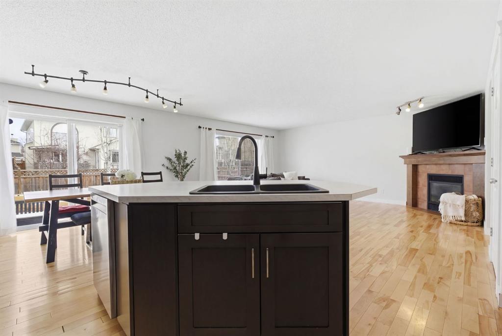 The living room is filled with natural light from large windows and features a cozy corner gas fireplace with a mantle—perfect for decorating and celebrating throughout the seasons. Hardwood flooring on the main level adds warmth and easy maintenance, while fresh paint in a warm, contemporary palette ties everything together beautifully.