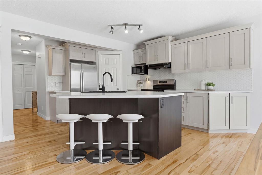 The open-concept kitchen features bright workspaces, updated appliances, a large corner pantry, central island, and a stunning hexagon backsplash. If you love cooking with gas, you’ll appreciate that a gas line is already in place. There’s also plenty of room to host, with space for an extra-large dining table.