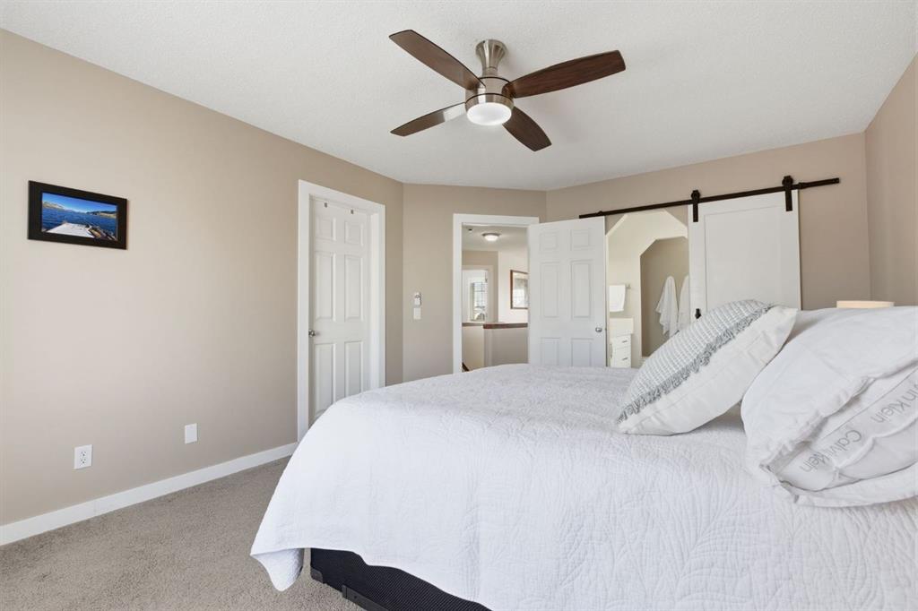 Upstairs, retreat to the spacious primary bedroom with room for all your furniture, including a king-sized bed. The ensuite is beautiful, featuring white subway tile, a crisp white vanity, a soaker tub, and a walk-in shower. It’s a bright, calming space where plants thrive—and you will too. A sliding barn door adds a touch of character.
