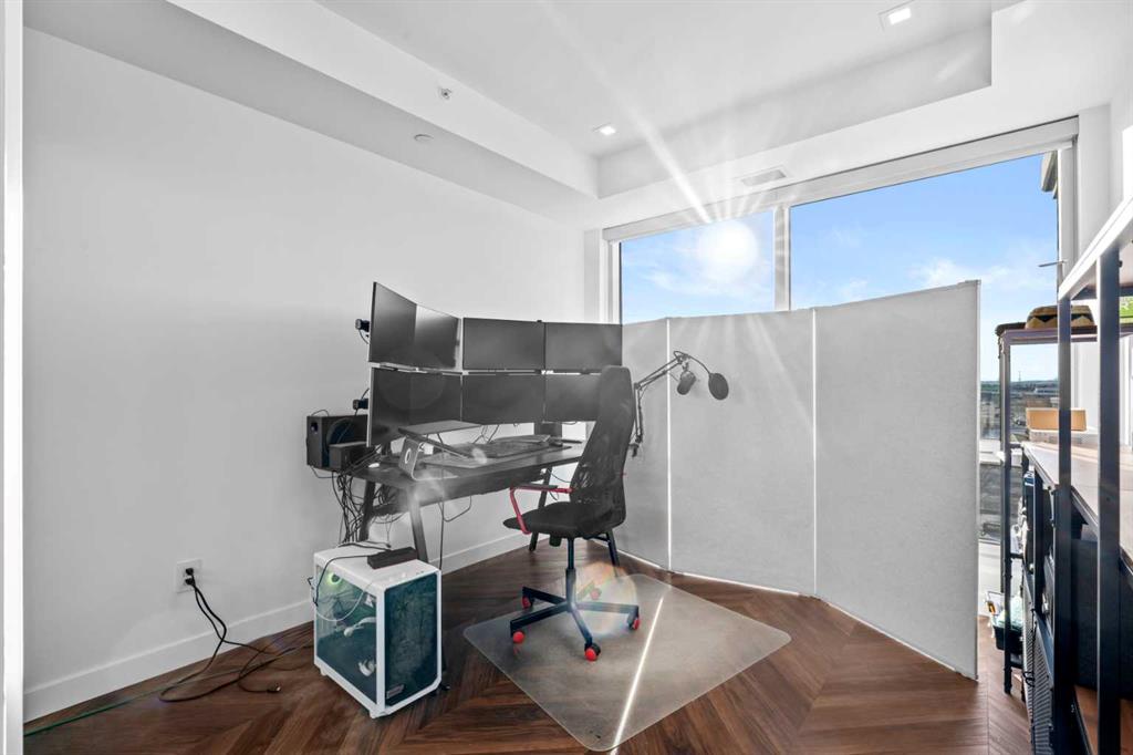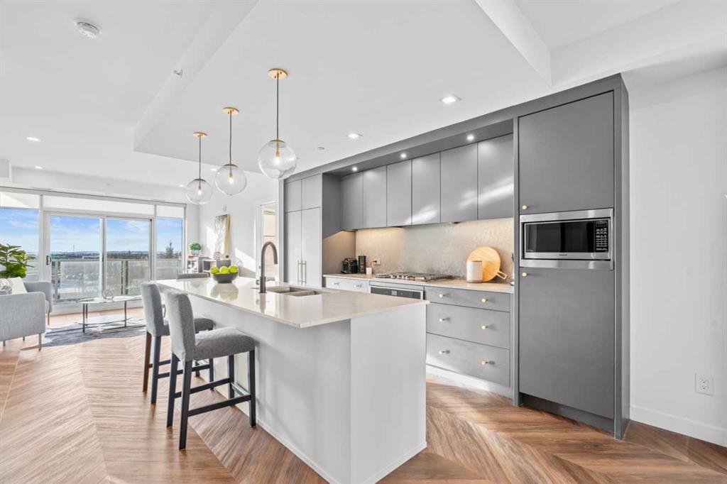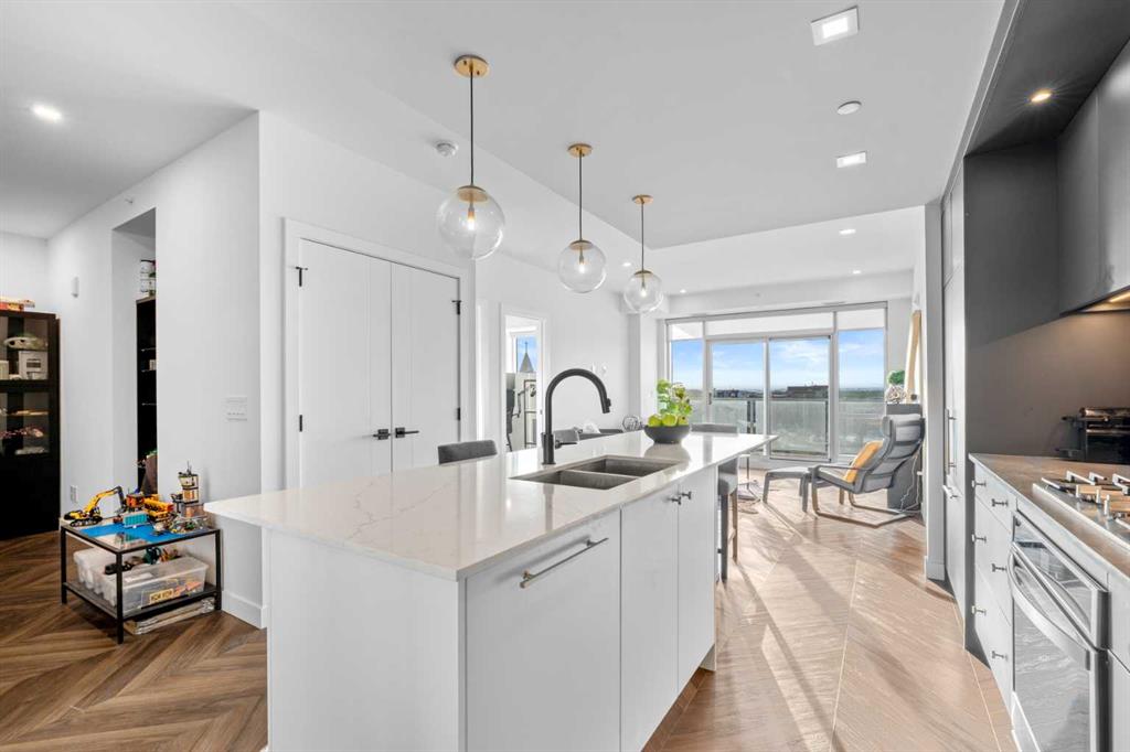 Welcome to Gateway West II – the epitome of urban elegance in West Calgary. This refined residence boasts an enviable location, featuring unobstructed mountain views and a spacious balcony. Nestled in one of Calgary's most sought-after neighbourhoods, you’ll find yourself mere steps from acclaimed dining establishments such as Fergus and Bix, Mercato, Blanco, and UNA. Families will appreciate the proximity to prestigious schools, including Saint Joan of Arc, Waldor, Calgary French and International School, and Rundle, while everyday conveniences like Co-op and other grocery stores are within easy walking distance. Spanning over 1,000 sq ft, the thoughtfully designed open-concept layout includes 2 generous bedrooms and 2 luxurious bathrooms, one of which is a spa-like ensuite. The chef-inspired kitchen caters perfectly to culinary aficionados, complemented by a versatile flex den/dining room space for seamless entertaining. Crafted with high-end finishes and premium appliances, this residence is well-suited for young professionals, growing families, and discerning investors alike. Enjoy effortless access to downtown, the Rocky Mountains, and Stoney Trail, ensuring a harmonious blend of convenience and stunning natural beauty. Additional features include central AC and titled underground parking. Take advantage of amenities such as the Lobby Concierge service, a party/event room, roof top patio, and secure underground visitor parking. Seize the opportunity to claim this extraordinary property and elevate your living experience in Calgary!