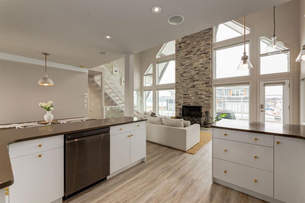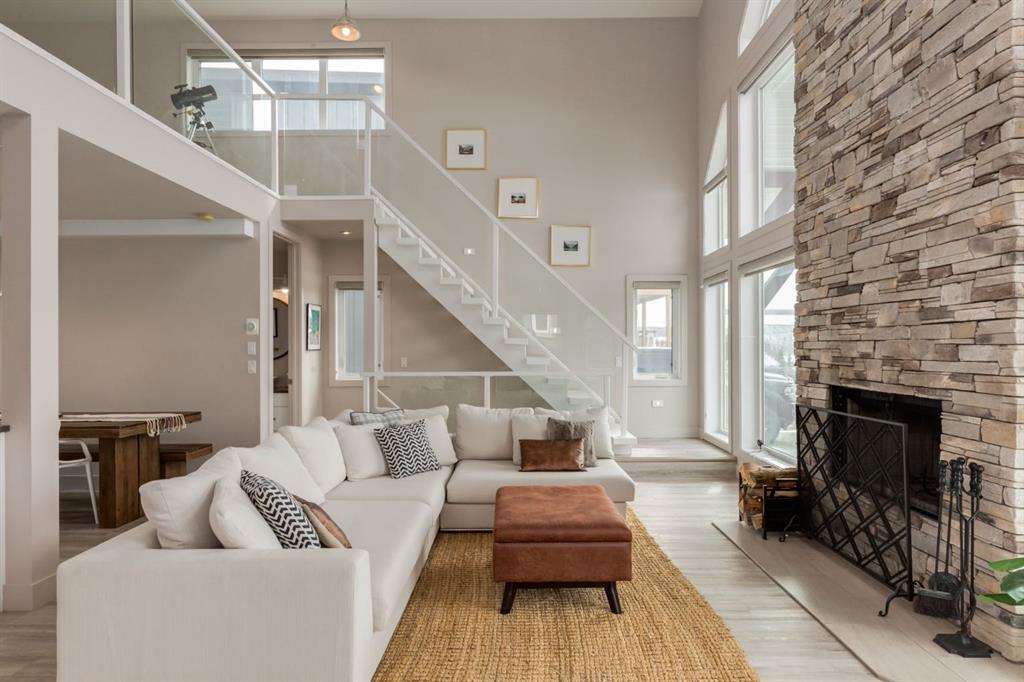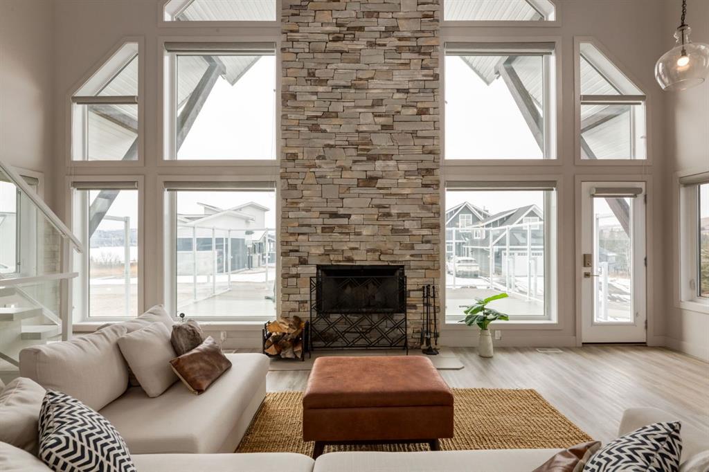 Modern architecture meets effortless lake living in this beautifully designed open-concept home. Soaring vaulted ceilings and a spacious great room with a cozy wood-burning fireplace create an inviting atmosphere, while durable laminate flooring flows throughout.