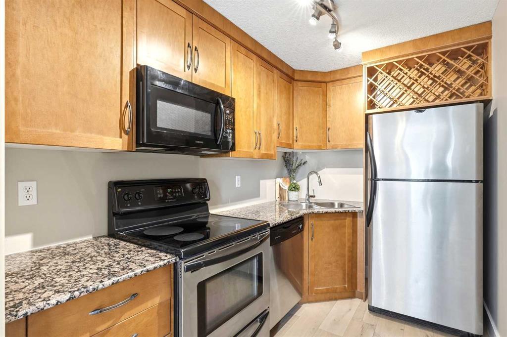The bedroom offers a peaceful retreat with a generous walk-in closet, and the 4-piece bathroom features a soaker tub. In-suite laundry, an additional storage locker, and an assigned underground parking stall round out the everyday essentials.