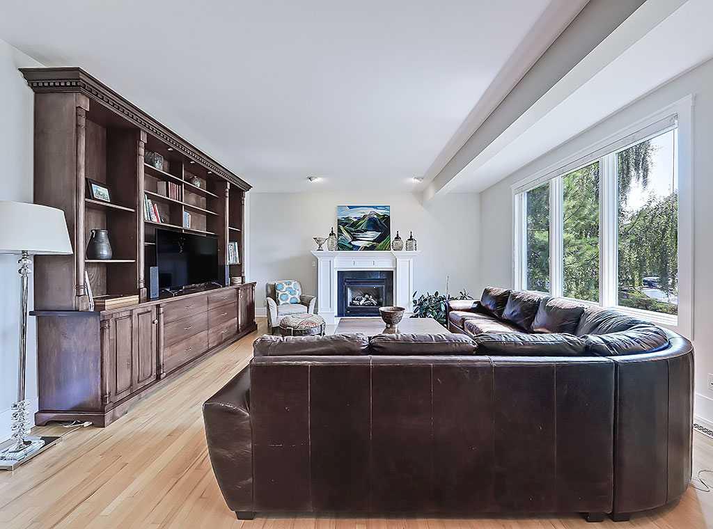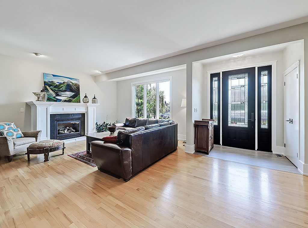 The main floor is bright and well-proportioned, with soaring ceilings and an open-concept layout that connects the family room (with gas fireplace) and kitchen — practical for daily life and easy for entertaining.