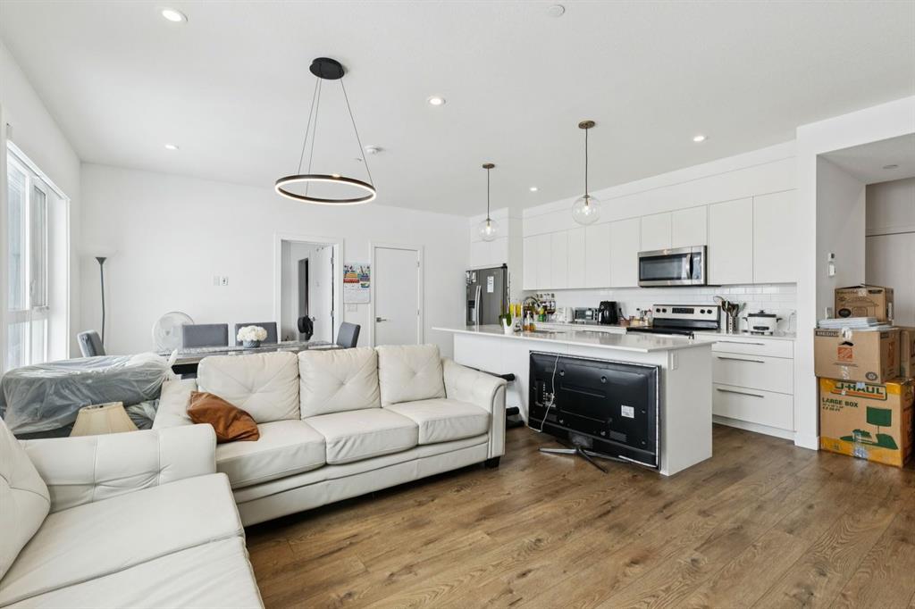 Rare opportunity to own a truly family-sized condo at an affordable price! This bright 4th floor CORNER unit with SW exposure basks in natural light all day long. This is an incredible layout with over 1,200 square feet including three generously sized bedrooms - so many options here for bigger families, multi-generational living or just space for your home office and hobbies. Plus, having TWO TITLED PARKING STALLS and plenty of visitor parking in the complex makes everyday life easy. The modern aesthetic of this unit means this unit is move-in ready from day one - stop renting and own your own home with condo fees of just $530/month. Enjoy an oversized kitchen, made for families and for entertaining with huge island, quartz counters, stainless steel appliances, pantry and chic pendant lighting. The open-concept living and dining areas can fit full-sized furniture and both look out toward the park space directly across from this unit. The oversized balcony with SW exposure is great for year-round BBQs and doesn't look toward another building, like so many condos with the fish-bowl effect. Both full bathrooms have a clean white aesthetic, with double sinks and a stall shower in the ensuite bath. This unit includes in-suite laundry, an assigned storage locker, one underground parking stall and one surface stall. The building has a secure bike storage room and is conveniently located near Metis Tr, Stoney Tr and Deerfoot Tr so you can easily get around the city, while Skyview has everything you need right in the community, from groceries to restaurants to schools (K-9 public school in walking distance!).