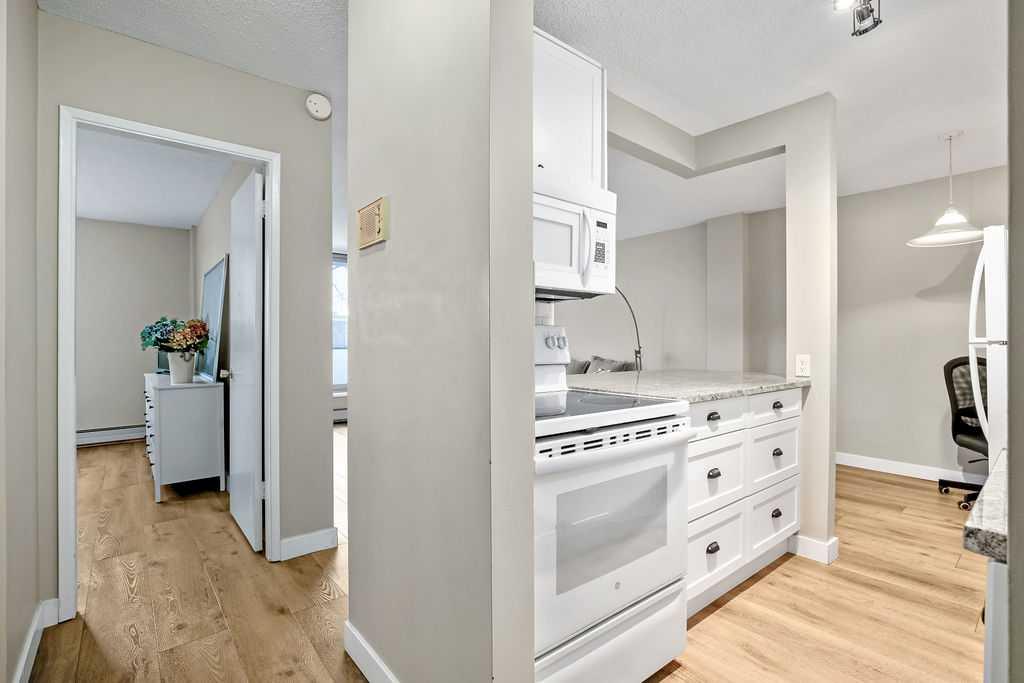 This 645 sq. ft. residence features durable and attractive vinyl plank flooring throughout, and a bright, open-concept layout highlighted by massive windows that flood the space with natural light. The updated kitchen showcases newer cabinetry with ample storage, beautiful stone countertops, and a functional design ideal for both everyday living and entertaining. Enjoy a top-floor location overlooking Riley Park, complete with stunning downtown city views—a true million-dollar view without the price tag. The fully renovated 4-piece bathroom features a deep soaker tub, striking tile work, and a large vanity offering excellent storage. Located just steps from Kensington’s shops, restaurants, and cafés, walking distance to the CTrain, and only minutes from SAIT (5 minutes) and the University of Calgary (10 minutes), this well-managed complex is ideal for first-time buyers, professionals, or investors looking to enter the rental market. Whether you’re seeking a vibrant urban lifestyle or a smart investment in a prime inner-city location, this Hillhurst condo delivers on location, views, and value.