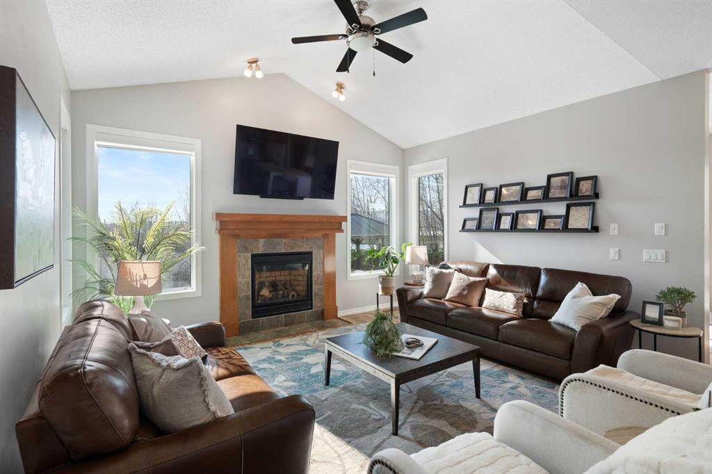 The main floor features a spacious living room with a gas fireplace and large windows for natural light. The kitchen has been updated with a renovated island, countertops, and backsplash, along with newer appliances including a stove (2024), dishwasher (2025), hood fan (2025), washer and dryer (2025), and refrigerator (2026). A dining area, breakfast nook, main-floor laundry, and 2-piece bathroom complete this level.
