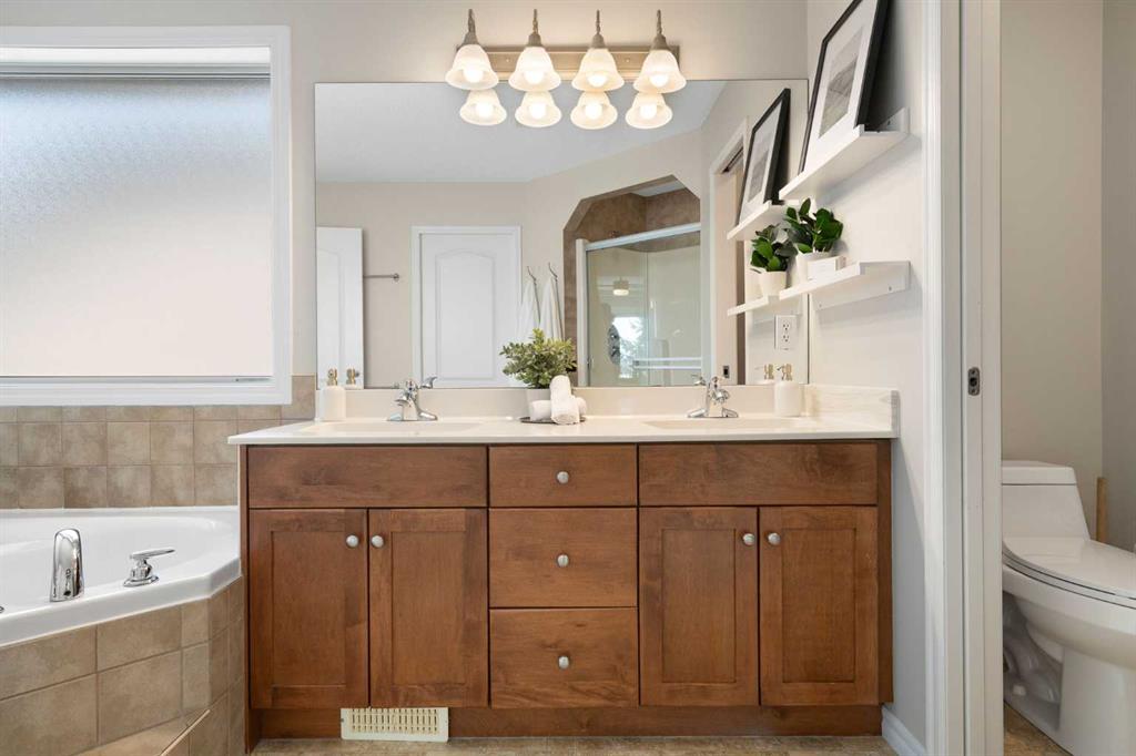 Upstairs includes a primary bedroom with a walk-in closet and 5-piece ensuite featuring dual sinks, a soaker tub, and separate shower. Two additional bedrooms, a 4-piece bathroom, and a bonus room provide additional living space.