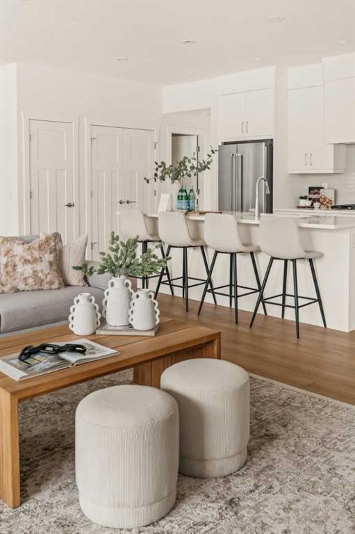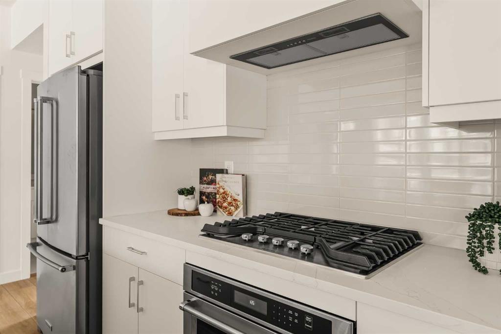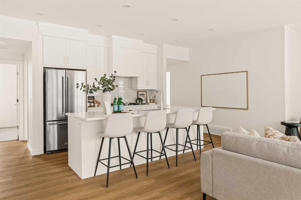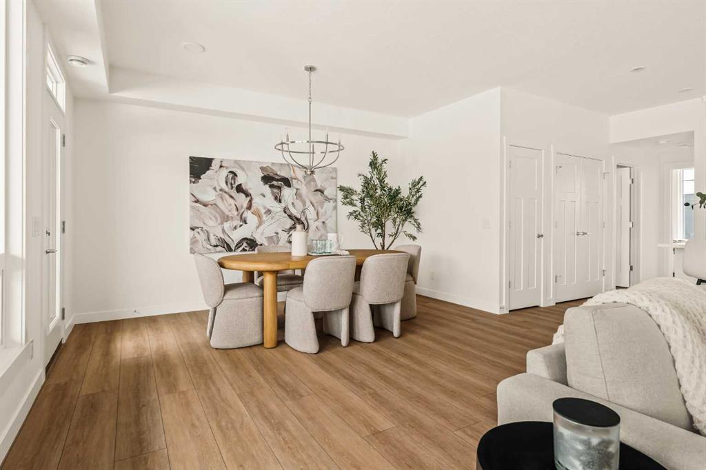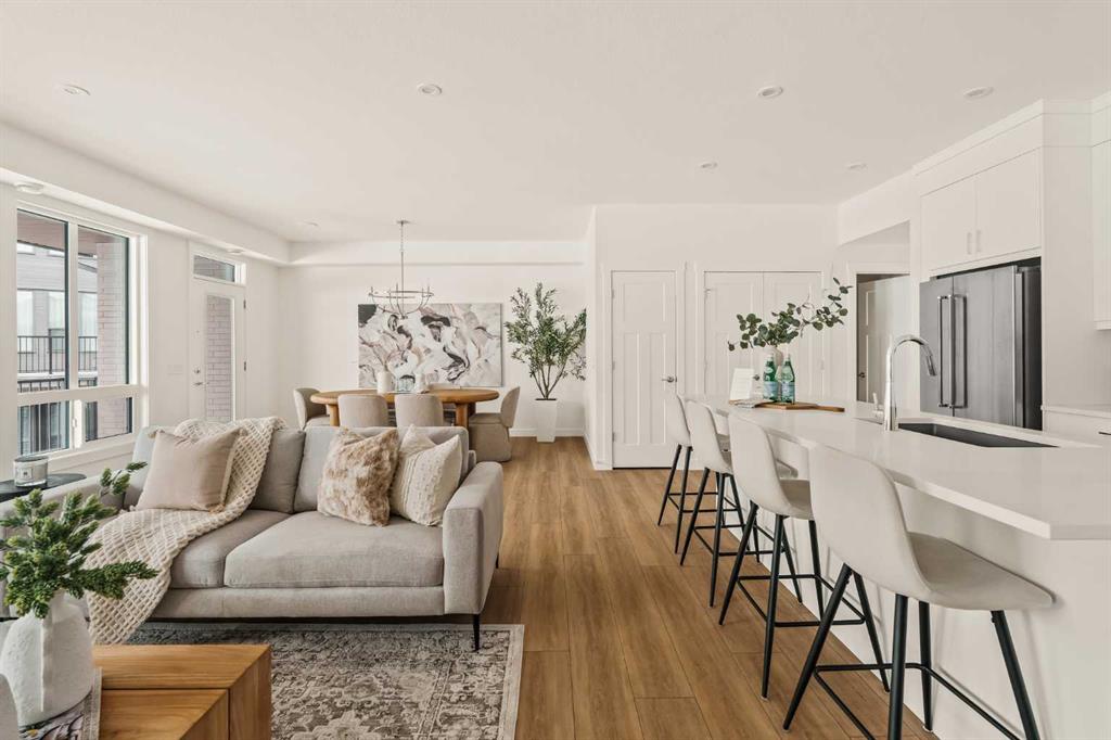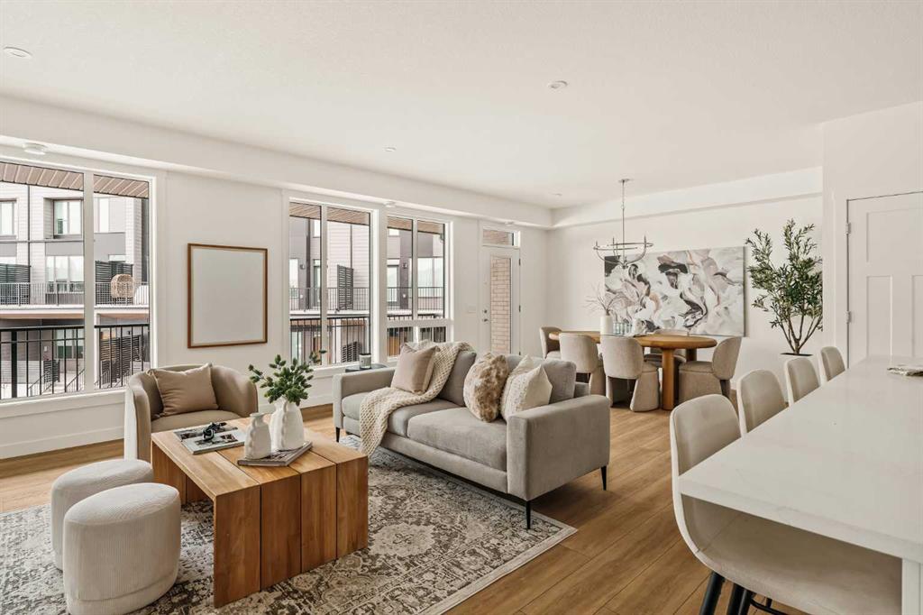 Offering bungalow-style living at its finest - the brand new Hyde at Crown Park presents a rare and refined take on single-level living. This is an exceptional opportunity to own one of the final brand-new bungalow-style townhomes in this highly sought-after inner-city community. Offering nearly 1,600 sq. ft. on a single level, this thoughtfully designed home features 3 bedrooms, 2 bathrooms, an oversized private double attached garage, and exceptional storage throughout - perfectly tailored for those looking to downsize without sacrificing the space, comfort, and functionality of a larger home. Set in the heart of Crown Park, this residence is ideally positioned with a sun-filled southwest-facing balcony overlooking the central park, just minutes from downtown Calgary. It’s the perfect balance of lock-and-leave convenience and vibrant inner-city living. The main living space is designed for both everyday ease and effortless entertaining. A timeless white kitchen anchors the home, seamlessly connecting to the dining and living areas, while an expansive wall of southwest-facing windows floods the space with natural light. Elevated finishes include quartz countertops and a premium built-in appliance package featuring an integrated hood fan, a gas cooktop, and a built-in oven. The spacious living room centers around a striking floor-to-ceiling tiled fireplace and offers ample room for gathering, while the generous dining area comfortably accommodates a full-size table for hosting family and friends. Resilient, warm-toned vinyl plank flooring flows throughout the main living area, making it ideal for children and pets. Thoughtfully designed for privacy, the primary retreat is tucked away from the secondary bedrooms, separated by the laundry area. This serene space features a large walk-in closet and a spa-inspired ensuite with dual vanities and a walk-in shower with 10mm glass. Two additional bedrooms provide flexibility for guests, a home office, or media room, supported by a well-appointed full bathroom. A dedicated laundry room with added cabinetry and folding space enhances everyday functionality. Outdoor living is equally impressive with an ~26’ x 8’ covered southwest-facing balcony, complete with a gas line, hose bib, and A/C rough-in - designed to maximize sunlight and usability throughout the seasons. The lower level offers access to the oversized double attached garage along with two substantial storage areas - a rare and valuable feature in bungalow-style living. Located within one of Calgary’s most exciting new inner-city communities, this home offers a true low-maintenance, single-level lifestyle backed by full builder warranty and Alberta New Home Warranty. Opportunities like this are exceptionally rare - single-level townhomes with private double garages, in a location like this, simply don’t come available often.