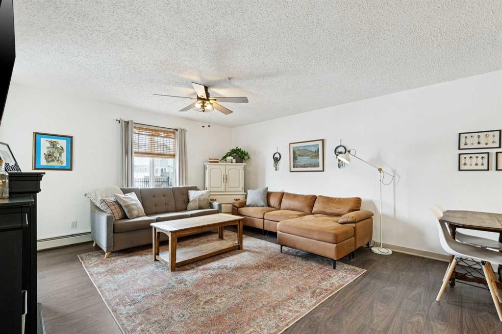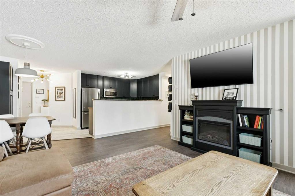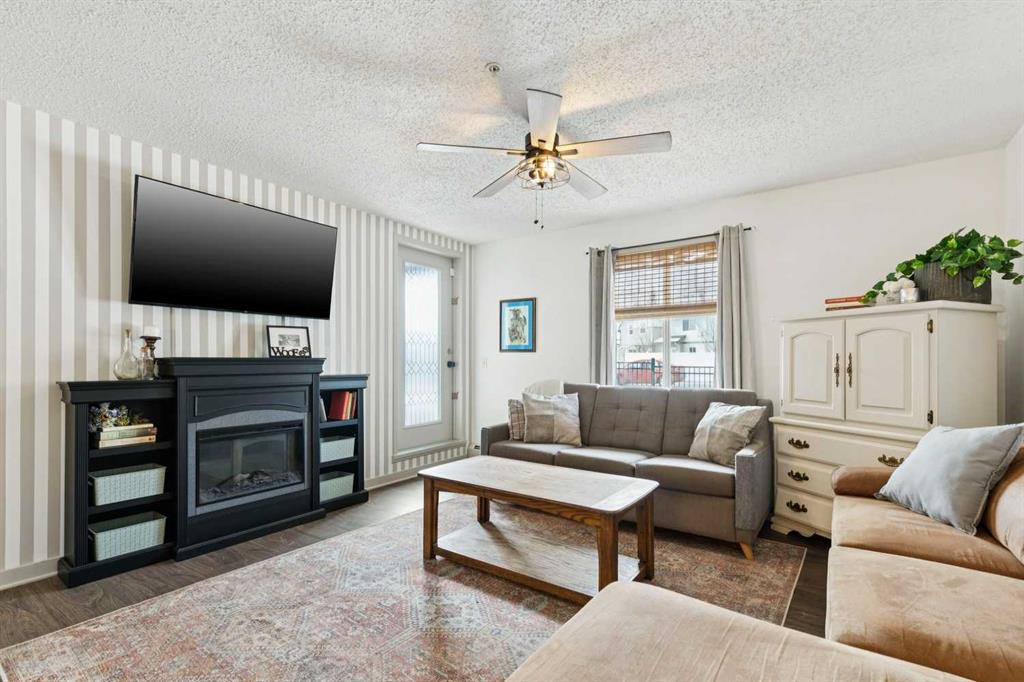 The open-concept design connects the kitchen, dining, and living areas seamlessly. The space is anchored by a cozy electric fireplace and large windows that flood the home with natural light.