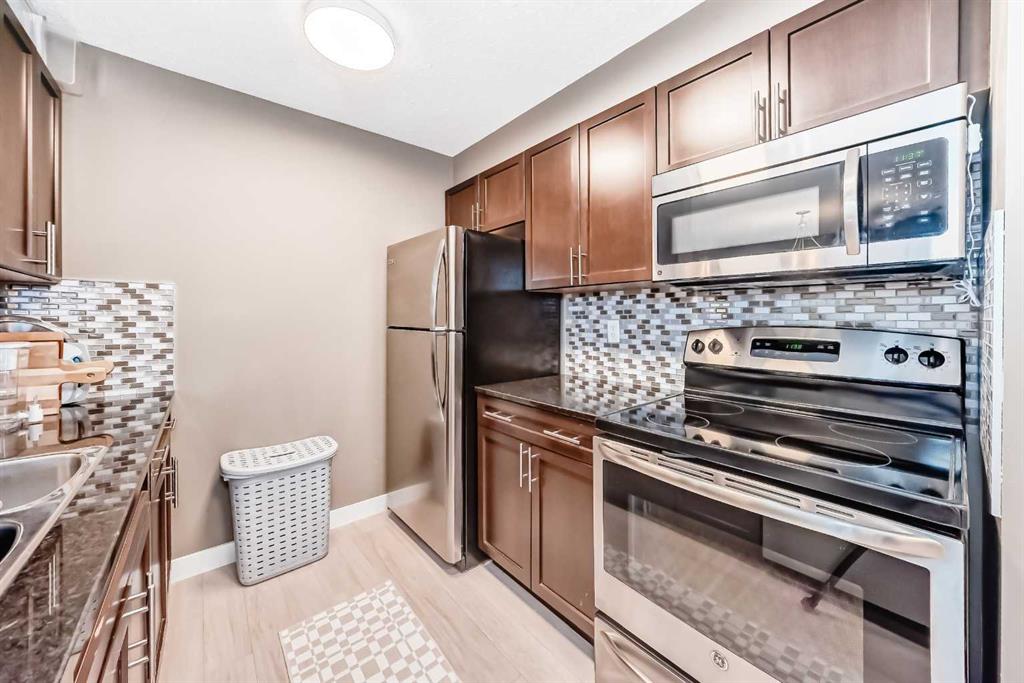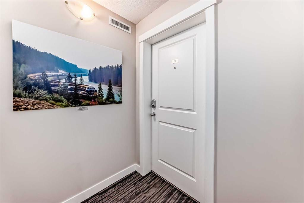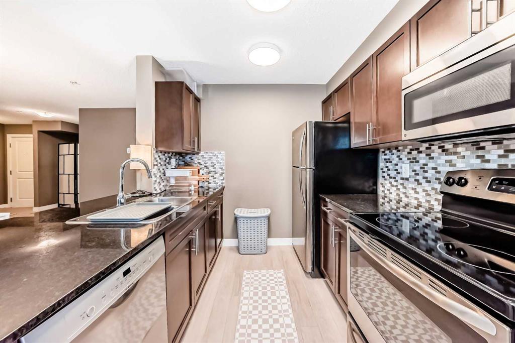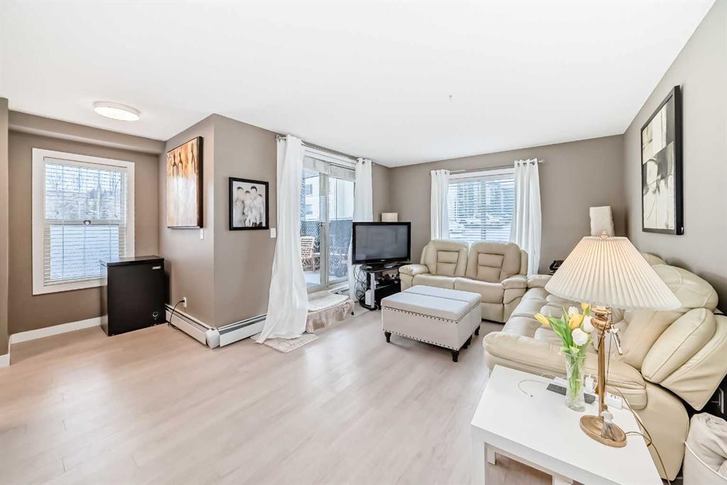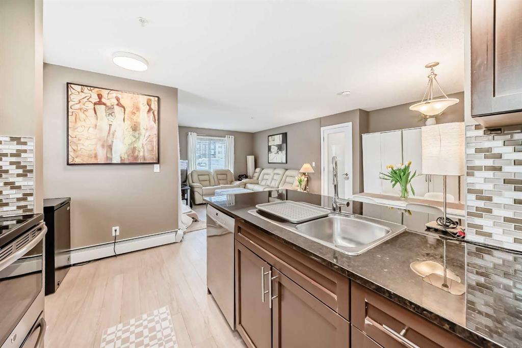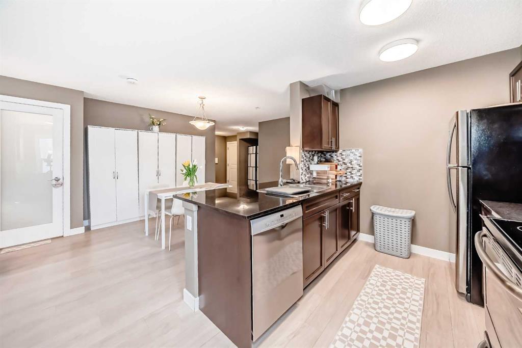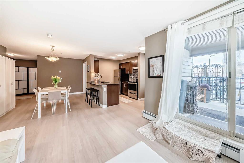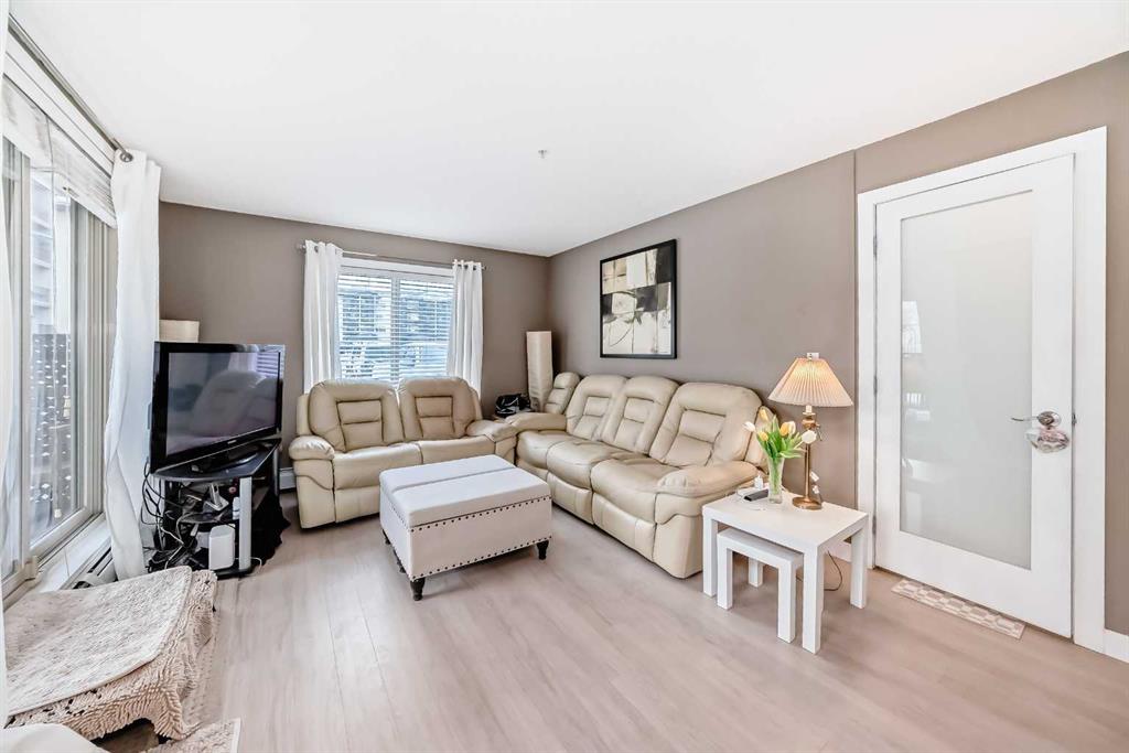 Welcome to this beautifully maintained corner ground floor apartment in the heart of Glenbow, Cochrane, offering a functional layout and exceptional convenience. This bright and inviting home features 2 bedrooms and 2 bathrooms, perfect for first time buyers, downsizers, or investors. The well appointed kitchen showcases stainless steel appliances including a new Bosch dishwasher, granite countertops, tile backsplash, ample cabinetry, and a convenient breakfast bar. New lighting throughout the home enhances the modern feel, while the spacious primary bedroom offers a walk through closet leading to a private 3 piece ensuite complete with granite countertops and a large stand up shower. A second bedroom and a full 4 piece bathroom provide flexibility for guests, family, or a home office. Both bathrooms have been updated with new shower heads. An in suite laundry room with additional storage adds everyday practicality, while the welcoming front entry features a full size coat closet. Ground floor access makes this home especially appealing for those seeking a no stairs lifestyle. This unit includes one titled underground parking stall (#291) and one assigned surface stall (#139). Ideally located just steps from Cochrane’s restaurants, coffee shops, grocery stores, parks and walking paths.