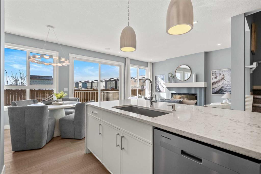 The main floor features a bright and spacious open-concept layout enhanced by large windows that allow natural light to fill the home. The chef-inspired kitchen showcases 42” upper cabinetry with crown moulding, quartz countertops, a central island with eating bar, and modern finishes that create both style and practicality. A separate spice kitchen offers additional preparation space, ideal for maintaining a clean and organized main kitchen. The dining and living areas connect seamlessly, while the electric fireplace in the great room creates a warm and inviting focal point. This level also includes a main floor bedroom and full bathroom, perfect for guests or multigenerational living, along with a versatile flex room that can function as a home office, study, or additional sitting area. Step outside to the rear deck with BBQ gas line, ideal for outdoor entertaining.