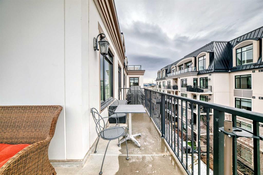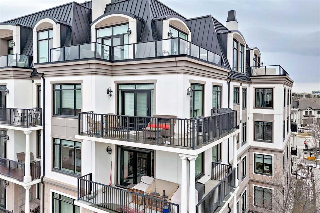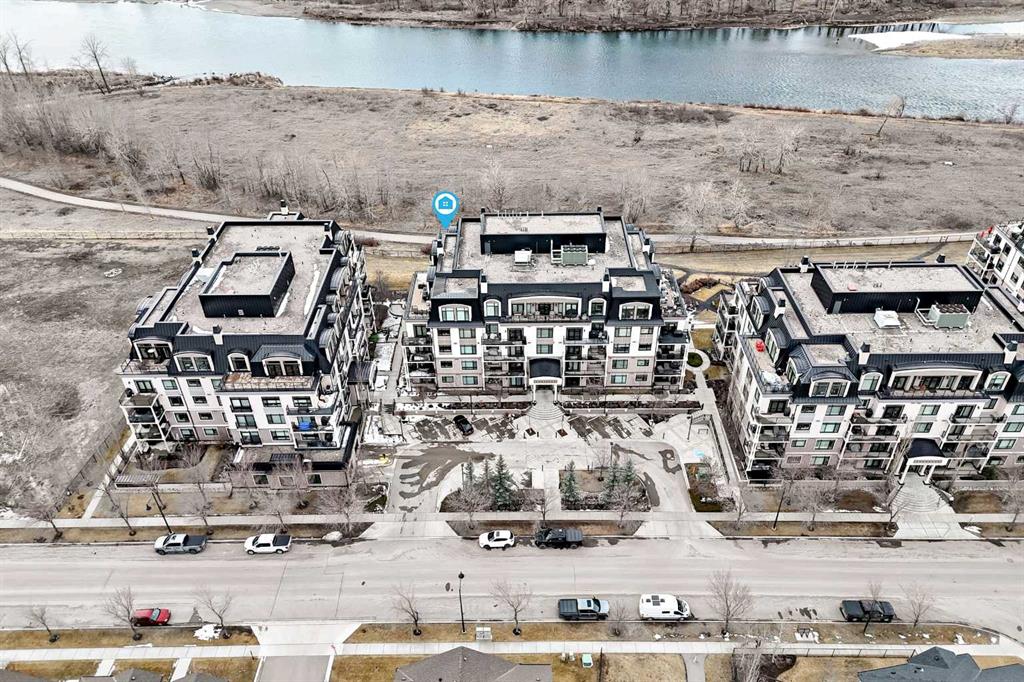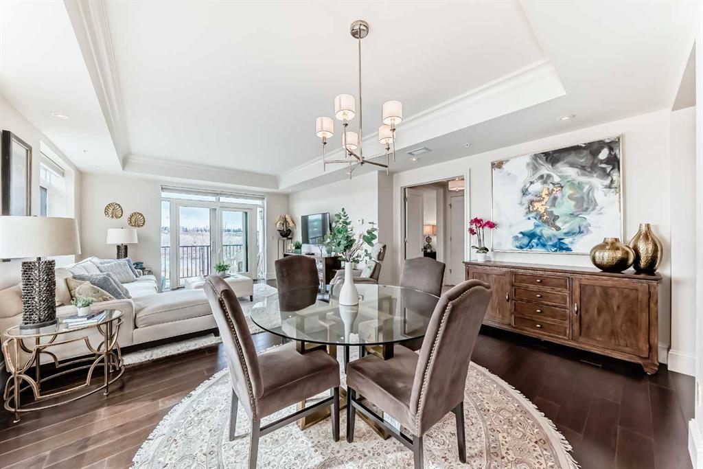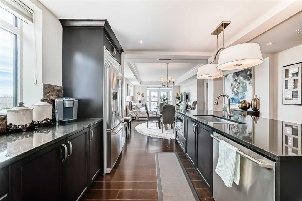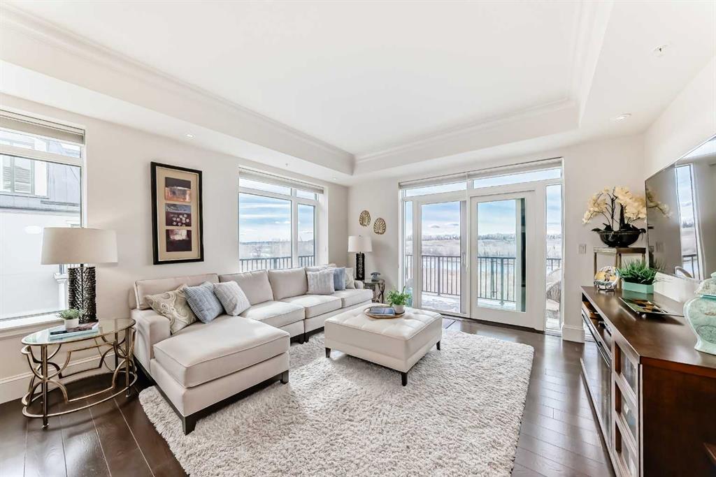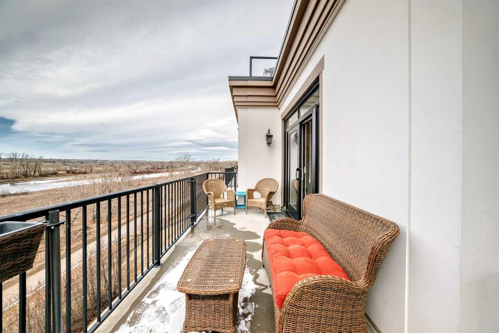 Welcome to this elevated 1426 sq ft 2 bed/2 bath end unit, with large wrap around balcony and sweeping views of the Bow River, in the sought after community of Quarry Park! The exceptional concrete Champagne building is the epitome of luxury, with the benefits of nature just steps away yet close to downtown, and this home showcases that in spades. Upon entering, you'll appreciate the 9' tray ceilings, gorgeous engineered hardwood, triple pane windows, & Hunter Douglas up down/bottom up cellular shades throughout the property. In the entryway, you'll find a large coat closet & separate laundry room, with additional storage, both with custom built-in's. The homeowners have thoughtfully built in a desk area with matching custom cabinetry to the kitchen & baths, with a granite top & built in bookcases, to take advantage of the wide hall space. A generous guest suite features large sunny windows and easy access to a serene Jack & Jill 4 pc bath and large storage closet with more custom built-in's. Moving into the main living space, you'll appreciate the many large windows on two sides, flooding the space in natural light. The kitchen showcases custom solid wood ceiling height cabinetry, a large island, granite countertops, Porter & Charles gas range, Electrolux fridge & dishwasher, built-in Panasonic microwave and garburator. The spacious living & dining area has plenty of room for a large dining table and sectional seating, perfect for hosting family & friends anytime. The stand out of the unit is the large wrap around balcony with room for both dining & relaxing, while enjoying your spectacular views of the Bow River, Fish Creek Park and downtown Calgary. The expansive primary suite features large sunny windows, with room for a king bed and seating area. The luxurious 5 pc ensuite continues with matching cabinetry & granite counters, a large linen tower, soaking tub and walk in glass shower. A large walk in closet with more custom built-in's complete the unit. Additionally, you will enjoy the two titled underground parking stalls & separate titled storage, as well as a car wash, bicycle storage and plenty of visitor parking. The well managed Champagne complex allows you to enjoy the lock & leave lifestyle with confidence. The location is bar none; just steps to the Fish Creek Park, where you can enjoy km's of walking & biking trails or fishing on the world class Bow River. As well, it's location is an easy walk to the fantastic amenities of Quarry Park, with Co Op grocery, retail and fantastic dining options. It's also an easy drive to get to Stoney Trail or Glenmore Trail, making getting around our beautiful city or heading out to the spectacular Rocky Mountains a breeze. This is truly one of a kind! Book your exclusive showing today!