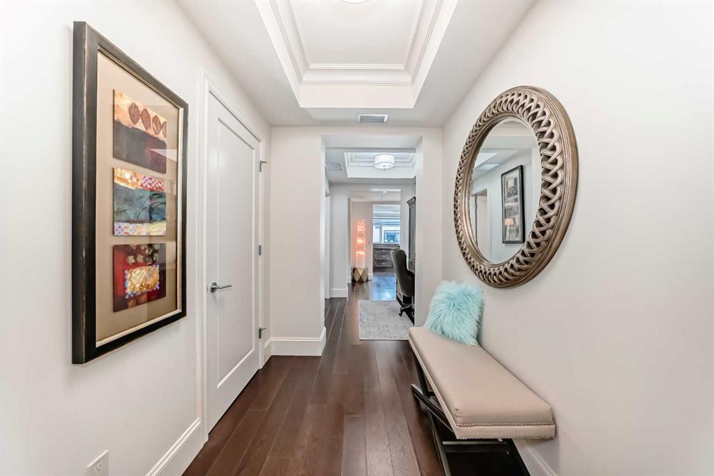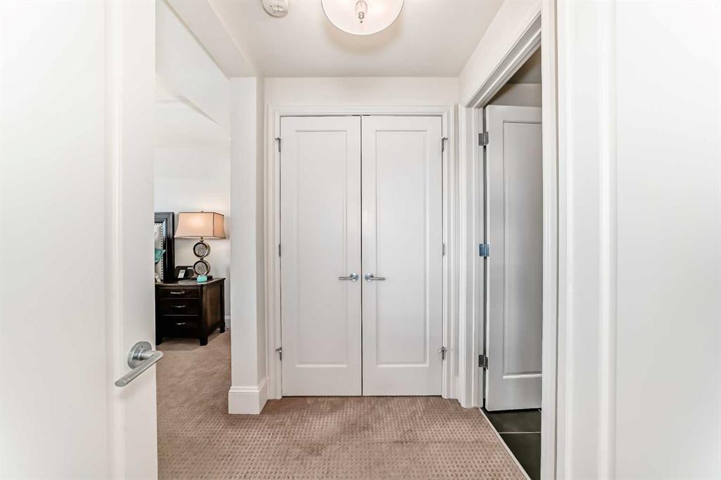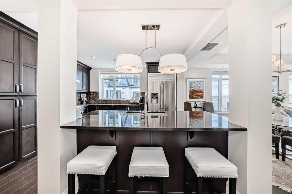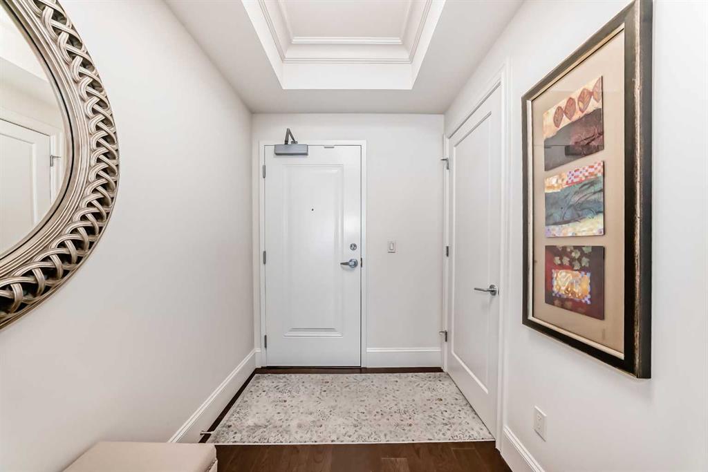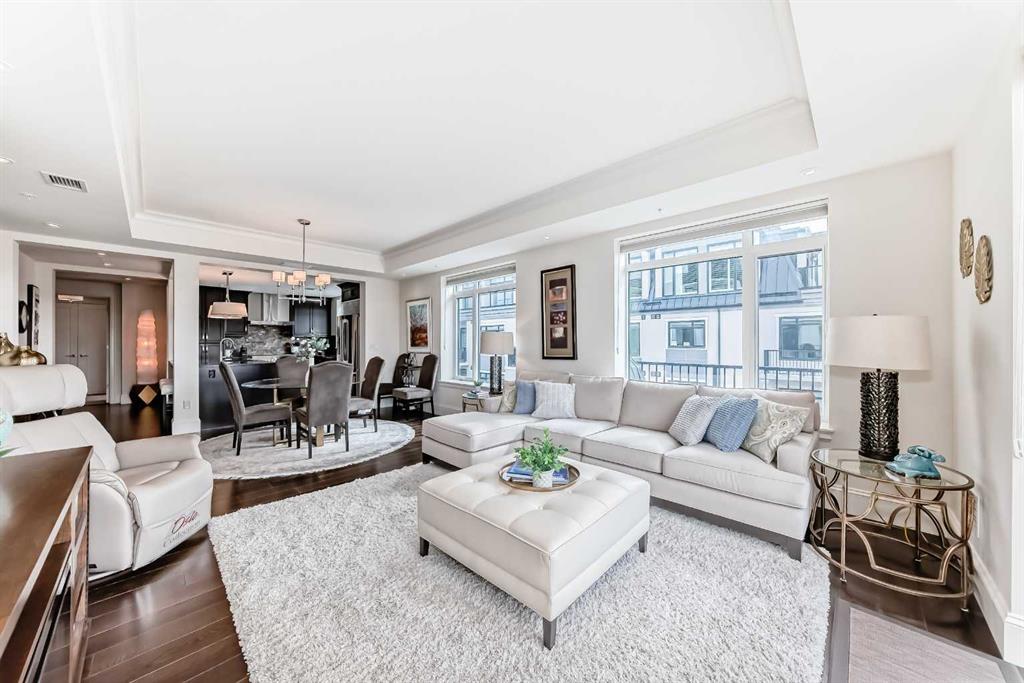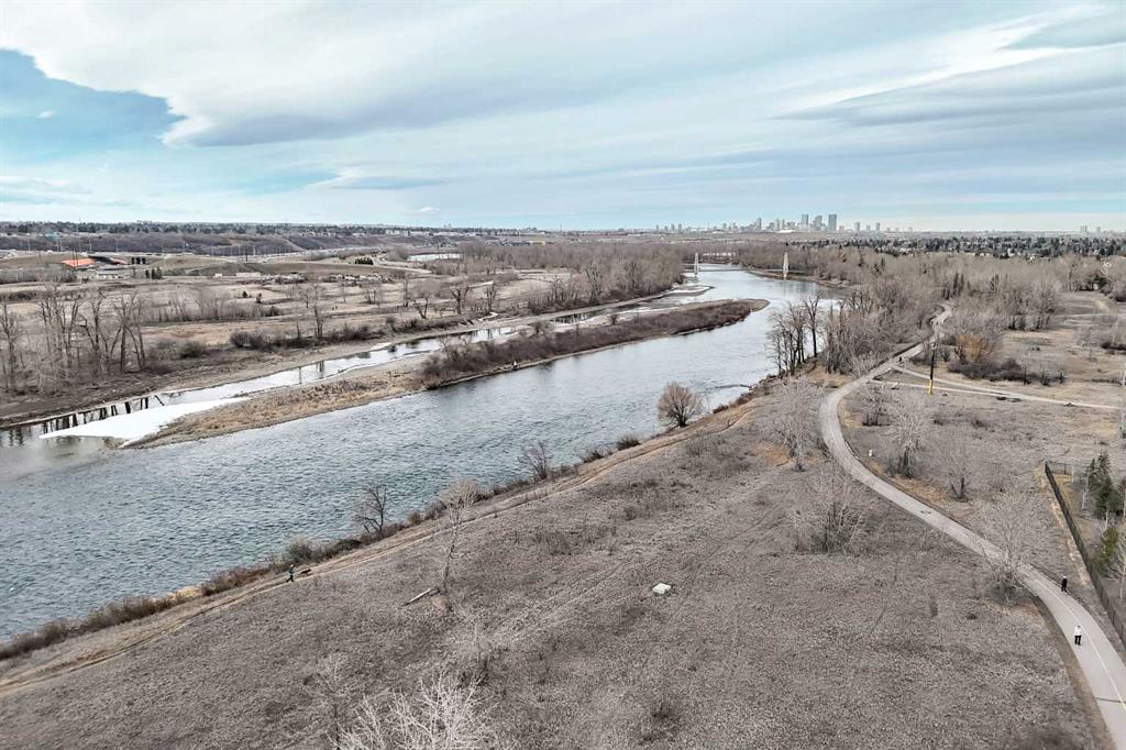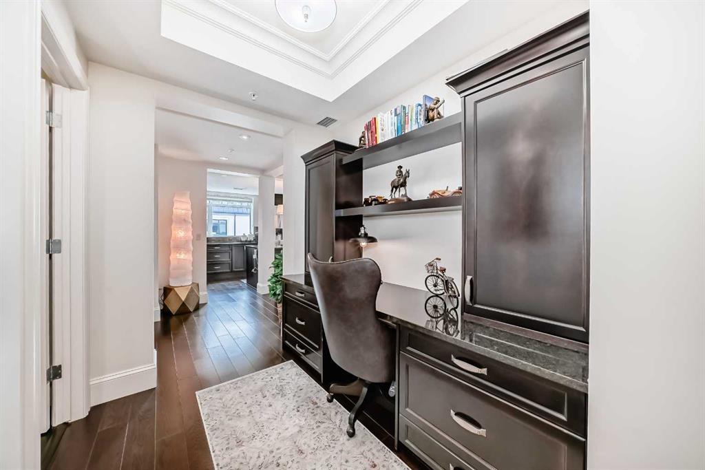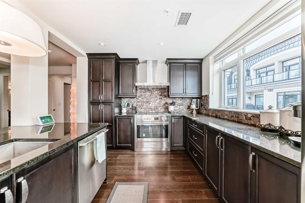 Welcome to this elevated 1426 sq ft 2 bed/2 bath end unit, with large wrap around balcony and sweeping views of the Bow River, in the sought after community of Quarry Park! The exceptional concrete Champagne building is the epitome of luxury, with the benefits of nature just steps away yet close to downtown, and this home showcases that in spades. Upon entering, you'll appreciate the 9' tray ceilings, gorgeous engineered hardwood, triple pane windows, & Hunter Douglas up down/bottom up cellular shades throughout the property. In the entryway, you'll find a large coat closet & separate laundry room, with additional storage, both with custom built-in's. The homeowners have thoughtfully built in a desk area with matching custom cabinetry to the kitchen & baths, with a granite top & built in bookcases, to take advantage of the wide hall space. A generous guest suite features large sunny windows and easy access to a serene Jack & Jill 4 pc bath and large storage closet with more custom built-in's. Moving into the main living space, you'll appreciate the many large windows on two sides, flooding the space in natural light. The kitchen showcases custom solid wood ceiling height cabinetry, a large island, granite countertops, Porter & Charles gas range, Electrolux fridge & dishwasher, built-in Panasonic microwave and garburator. The spacious living & dining area has plenty of room for a large dining table and sectional seating, perfect for hosting family & friends anytime. The stand out of the unit is the large wrap around balcony with room for both dining & relaxing, while enjoying your spectacular views of the Bow River, Fish Creek Park and downtown Calgary. The expansive primary suite features large sunny windows, with room for a king bed and seating area. The luxurious 5 pc ensuite continues with matching cabinetry & granite counters, a large linen tower, soaking tub and walk in glass shower. A large walk in closet with more custom built-in's complete the unit. Additionally, you will enjoy the two titled underground parking stalls & separate titled storage, as well as a car wash, bicycle storage and plenty of visitor parking. The well managed Champagne complex allows you to enjoy the lock & leave lifestyle with confidence. The location is bar none; just steps to the Fish Creek Park, where you can enjoy km's of walking & biking trails or fishing on the world class Bow River. As well, it's location is an easy walk to the fantastic amenities of Quarry Park, with Co Op grocery, retail and fantastic dining options. It's also an easy drive to get to Stoney Trail or Glenmore Trail, making getting around our beautiful city or heading out to the spectacular Rocky Mountains a breeze. This is truly one of a kind! Book your exclusive showing today!