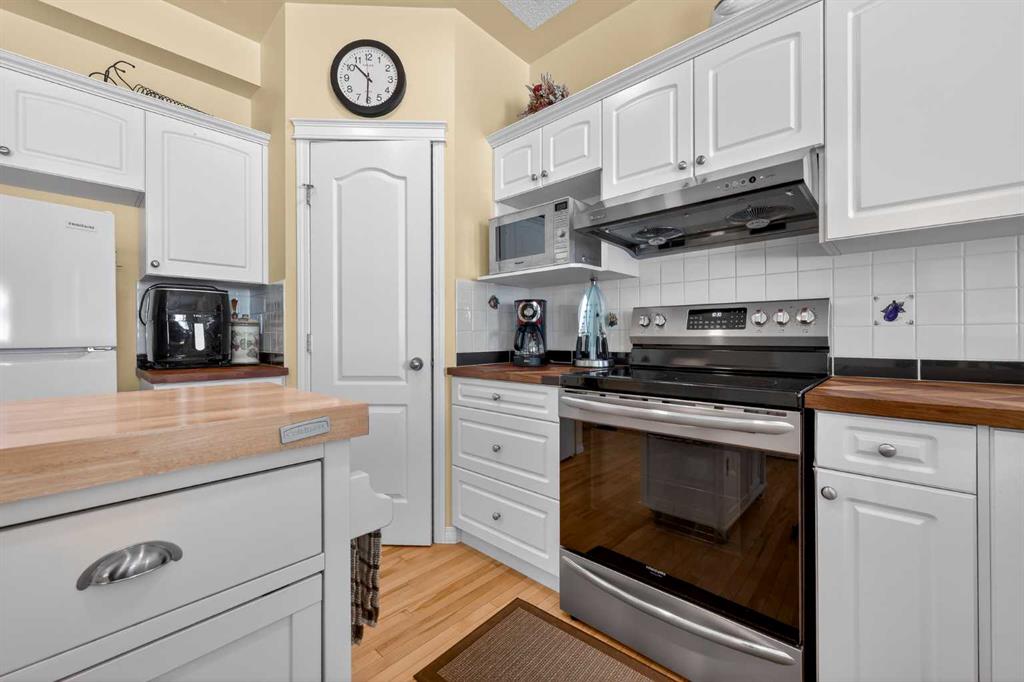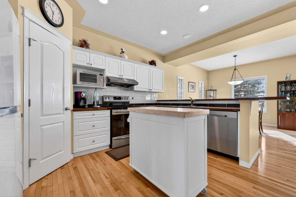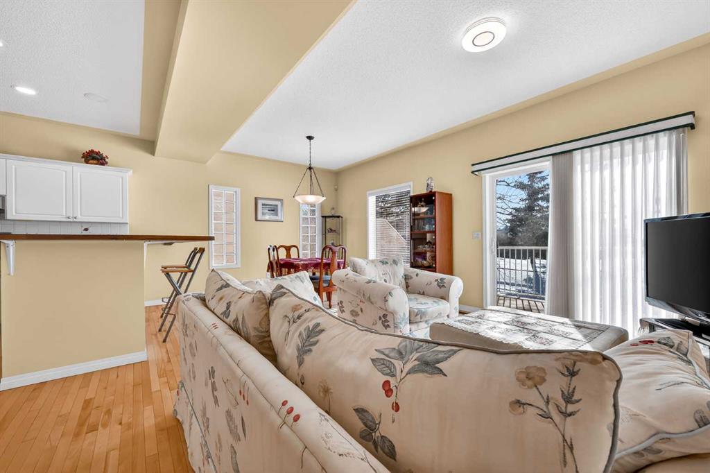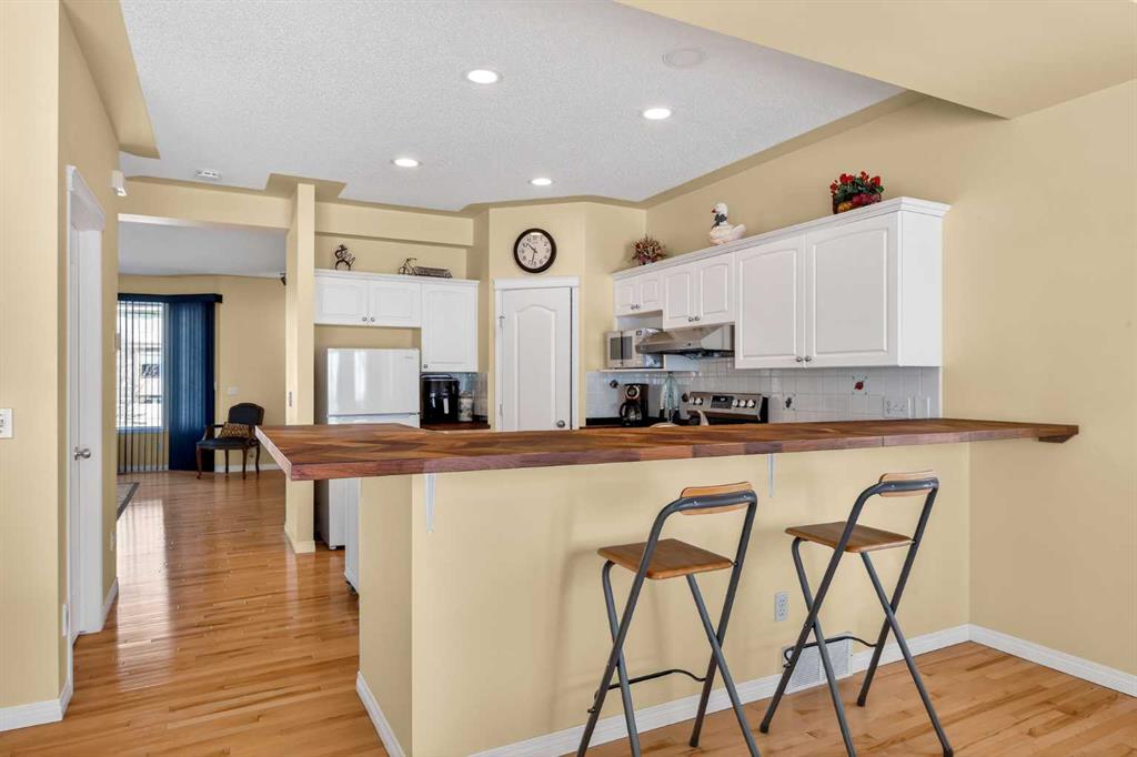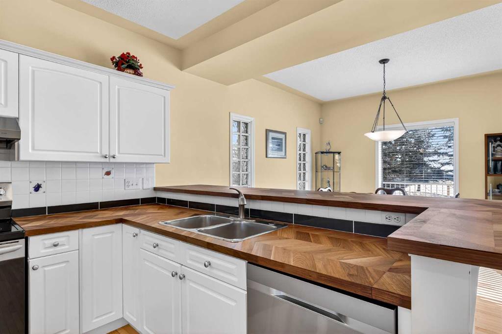 Step inside to a bright and inviting living space featuring soaring ceilings, a cozy gas fireplace, and a large bay window that fills the home with natural light while showcasing serene views of the private green space and charming gazebo. The spacious white kitchen is both functional and stylish, complete with updated appliances, a mobile island, breakfast bar, and a dedicated coffee station—ideal for everyday living and entertaining. The adjacent family room & dining area provides seating and easily accommodates a large table for gatherings and through patio doors opens to a southwest-facing upper deck, complete with a BBQ gas line.