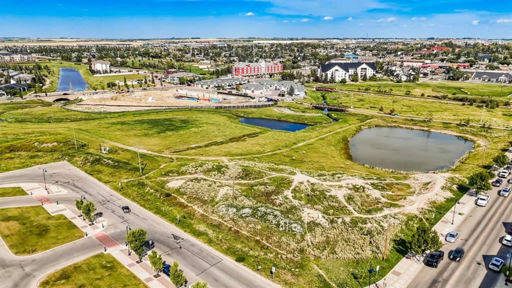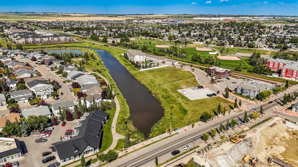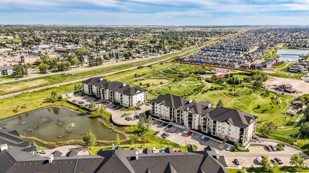 Welcome to your new home at Creekside Village in the heart of downtown—a spacious west-facing 2-bedroom, 2-bathroom condo with a versatile den designed for modern living. Perfect for couples, small families, or professionals, the den can easily be used as a home office, dining nook, or guest space, adapting to your lifestyle. Step inside to a bright open-concept layout with a wide entrance and a generous living/dining area—ideal for entertaining or relaxing. The upgraded kitchen features granite/quartz countertops, stainless steel appliances, ample cupboard space, and a breakfast bar. A separate in-suite laundry room provides added convenience, while the primary bedroom offers a private 4 piece en-suite with granite vanity and soaker tub. The second full bathroom includes a soaker tub and matching granite vanity, and both bedrooms feature large windows and ample closet space for natural light and functionality. Enjoy your morning coffee or evening wind-down on the covered patio and take advantage of 2 titled underground parking stalls for year-round security and ease. Located in a vibrant community in Downtown Airdrie, this condo places everything at your fingertips: Midtown Shopping Square, grocery stores (Sobeys), restaurants, coffee shops, salons, medical clinics, pharmacies, day care, yoga/fitness centers, playgrounds, schools, and parks—all just a short walk away.