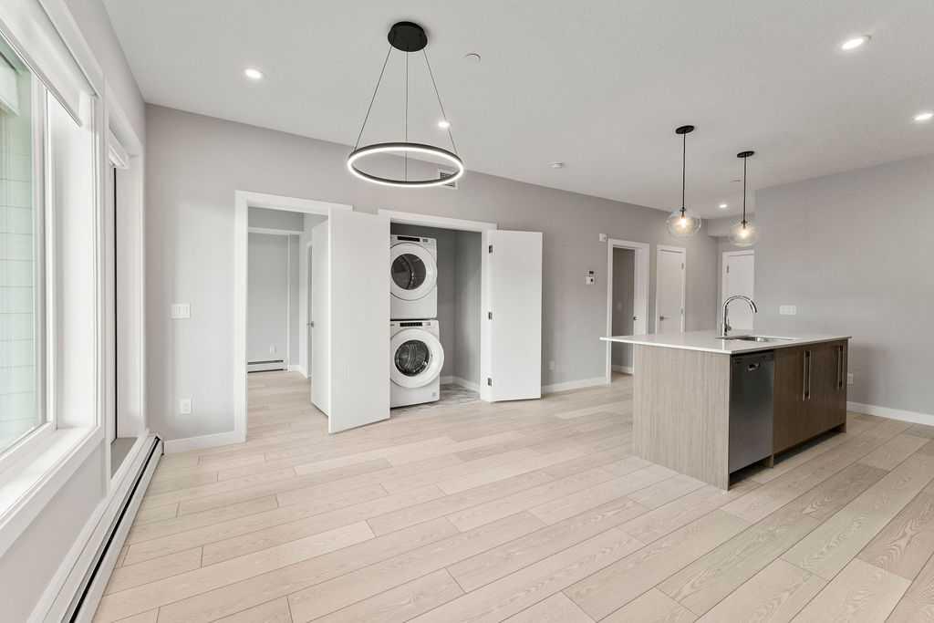 flooring, contemporary lighting, in-suite laundry, and a private balcony off the living room, ideal for relaxing. Skyview North is perfectly located near Sky Point Landing, with easy access to shopping, parks, and playgrounds, plus, seamless commuting via Stoney and Deerfoot Trails.