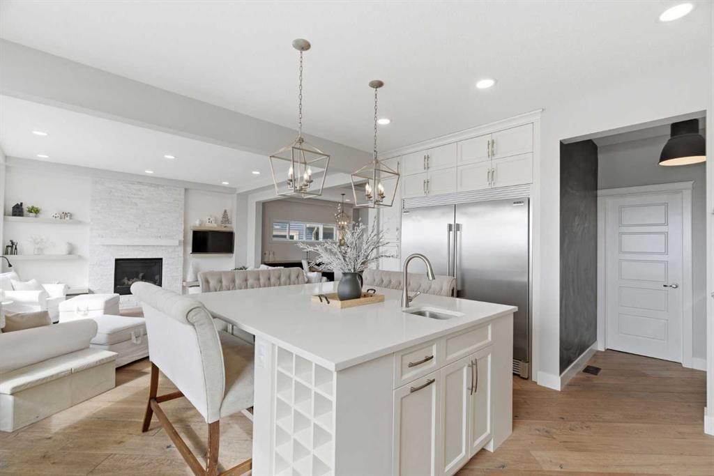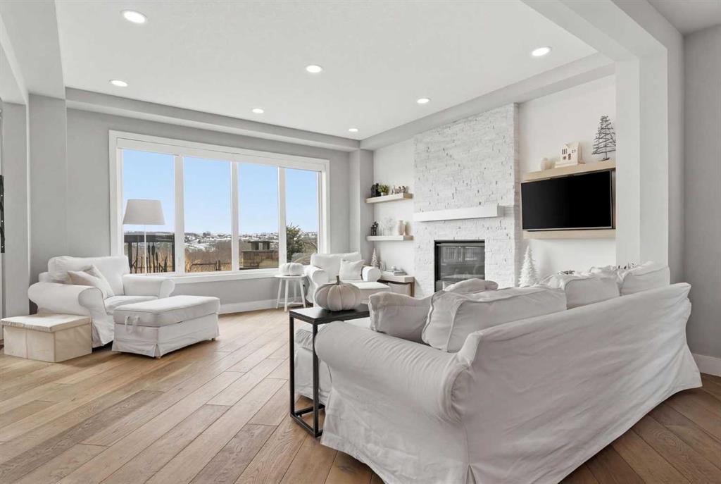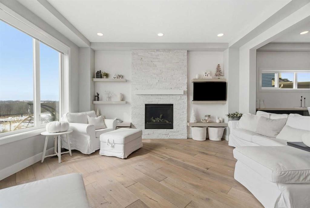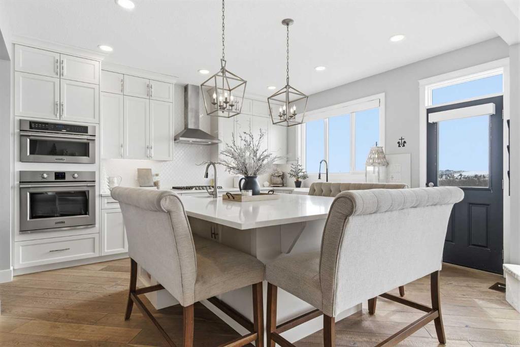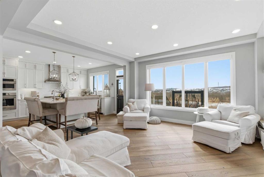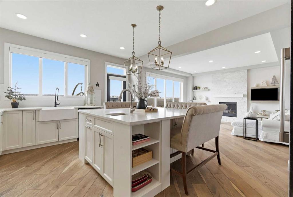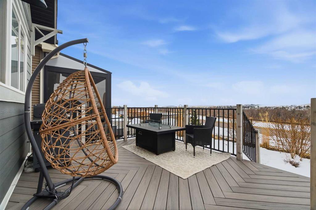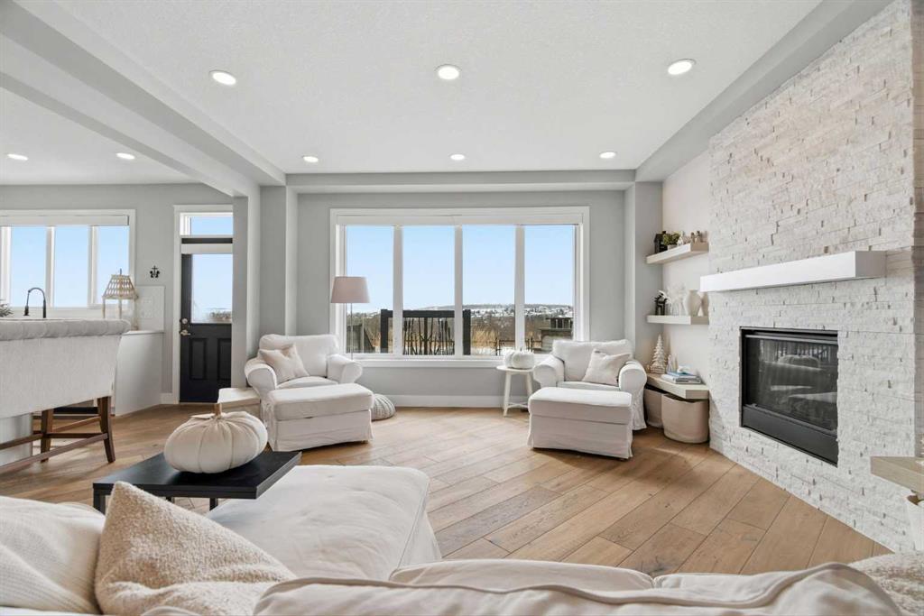 Perched on a sun-soaked south-facing ridge, this stunning home offers truly breathtaking MOUNTAIN and RIVER VALLEY views you’ll never tire of. With almost 3,700 sq ft of beautifully finished living space across three levels, this property blends high-end craftsmanship with thoughtful, functional design throughout. The main floor immediately impresses with upgraded hardwood flooring, tray ceilings, a dedicated home office, and a well-designed mudroom complete with custom built-ins and lockers. The open-concept layout is perfect for both everyday living and entertaining, featuring a spacious dining area with a built-in buffet and custom shelving that flows seamlessly into the inviting living room. Here, a gorgeous stone fireplace and expansive windows frame those unforgettable panoramic views. At the heart of the home is a truly show-stopping, award-winning kitchen. Designed for both style and performance, it features an industrial-sized fridge/freezer, built-in appliances, double dishwashers, and ceiling-height cabinetry with soft-close features. A walk-through butler’s pantry connects to a massive walk-in pantry for ultimate convenience. The oversized 38 sq ft island is perfect for gathering—comfortably seating the whole family while you take in sweeping 180-degree views over Okotoks. This kitchen is more than just functional—it’s a standout feature of the home. Upstairs, enjoy brand NEW HARDWOOD flooring. The thoughtfully placed family room creates separation between the children’s or guest wing and the impressive primary retreat. The primary suite is a sanctuary, with vaulted ceilings in both the bedroom and ensuite, elegant upgraded lighting, and incredible views of the Sheep River and Rocky Mountains that change beautifully with the seasons. A well-appointed laundry room on this level includes plenty of cabinetry, a sink, and built-in drying racks. The additional front bedrooms offer flexible space to suit your needs. The fully finished basement carries a modern loft-style feel with upgraded LVP flooring. This level offers incredible versatility with space for a home office or study area, a private gym with durable rubber flooring, an additional bedroom, and a spa-inspired 3-piece bathroom with heated floors. Smart design ensures plenty of storage throughout, along with custom barn doors to easily create privacy where needed. Step outside to your own private backyard retreat, designed for low-maintenance enjoyment year-round. Featuring zero-scaped landscaping, a custom herringbone deck, stone patio, and a built-in fireplace, this space is ideal for relaxing or entertaining. You’ll even have a front-row seat to local fireworks throughout the year. Located just steps from scenic walking paths, the Sheep River, and the charm of downtown Elizabeth Street, this home offers the perfect balance of peaceful small-town living with the convenience of being only 15 minutes from Calgary.